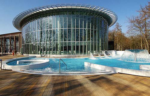 Het eerste wat mij opvalt is de zwemkledij. Niemand zwemt naakt, binnen noch buiten. Handig. Op de eerste verdieping bevinden zich twee welnesszones: eentje voor de naakte mensen, eentje voor zij met zwembroek of bikini. We verkennen eerst de nudistische ruimte. Minder groot dan aanvankelijk gedacht met een sauna, een hammam en 3 baden (jacuzzi, warm 38° C en koud 20° C). De ruimte voor de iets preutsere thermgangers blijkt nog beperkter: geen baden hier, wel een afgesloten relaxruimte met black lights.