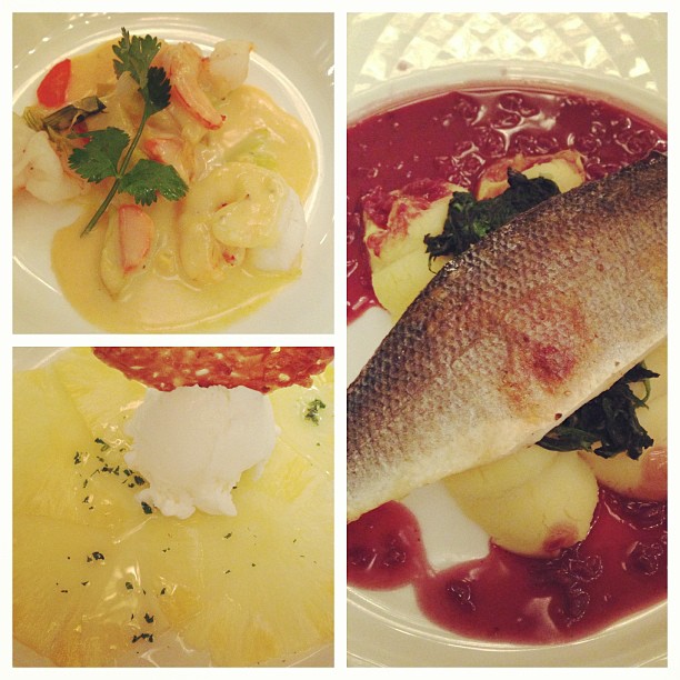 Tegen 19u30 tekenen we present in de brasserie ‘Les Saisons de Spa’ van het hotel voor het avondmaal. Het arrangement omvat een driegangenmenu en per gang kunnen we telkens kiezen uit drie opties. Als voorgerecht pikken we allebei de tiger prawns met rode curry en Chinese groentenmengeling. Ik ga verder met zeebrasem, geplette aardappel, spinazie en rodewijnsaus. Hij opteert voor de ragout van hinde, fruit uit de Hoge Venen en kroketten. Dessertgewijs rond ik af met een carpaccio van ananas, muntsiroop en amandelijs. Hij prefereert de moelleux van chocolade met speculoosijs.