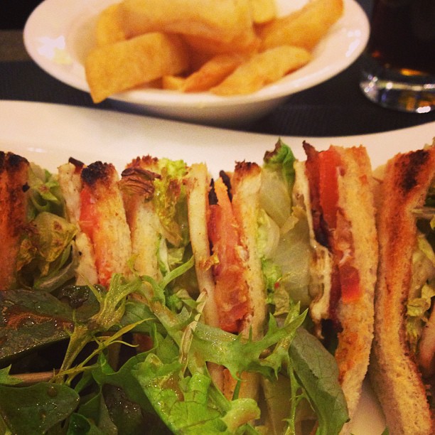 De rit Gent – Spa vraagt ons net iets meer dan twee uur. Eerst rijden we voorbij het Radisson Blu Balmoral Hotel in Spa, maar deze gewaarschuwde vrouw navigeert verder tot aan het Radisson Blu Palace Hotel in het centrum. Na een akkefietje bij het inchecken installeren we ons in onze Standard Room. Voldoende ruim, ligbad en zo’n heerlijk hotelbed met dito matras en te veel hoofdkussens. Het regent, pijpenstelen, cats and dogs, you name it. Dus dalen we terug af naar de bar voor een late lunch. ‘Un véritable club sandwich avec frites’ (€ 17 – prijzig dus) en een wrap met gelakt varken (€ 14,50) graag. Dat laatste blijkt niet meer voorradig, dus switcht mijn meneer met plezier naar een carpaccio van rund. Ik drink cola light, hij een blonde Grimbergen van het vat (€ 5,75). Een potje wasabinootjes en een potje olijven later verschijnen onze borden. We hoopten al dat er wat waar zou zijn voor het geld en dat blijkt absoluut het geval. Mijn club sandwich met kip, bacon, ei, sla en tomaat konden we eigenlijk gerust delen. De grove frieten smakelijk spectaculair goed! Ook de carpaccio begeleid door rucola, parmezaan, pijnboompitten en rauwe champignons bevalt – al roept vlees in perfecte rondjes wel wat vragen op.