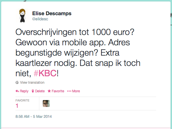 ‘Met KBC Twittercare…’ Echt? Ik begin inwendig te gniffelen, maar luister vanzelfsprekend aandachtig naar hun extra uitleg bij mijn tweet. Ze eindigen met de vraag of ik er nog iets wil over tweeten, of zij dat zelf doen. Ik verzeker dat dat absoluut in orde komt. Niet omdat ze het vragen, wel omdat het mijn eerste telefoontje is van een Twitter helpdesk. Is dat het Davy Kestens effect? Ferm! En ik was al zo’n tevreden klant van KBC.
