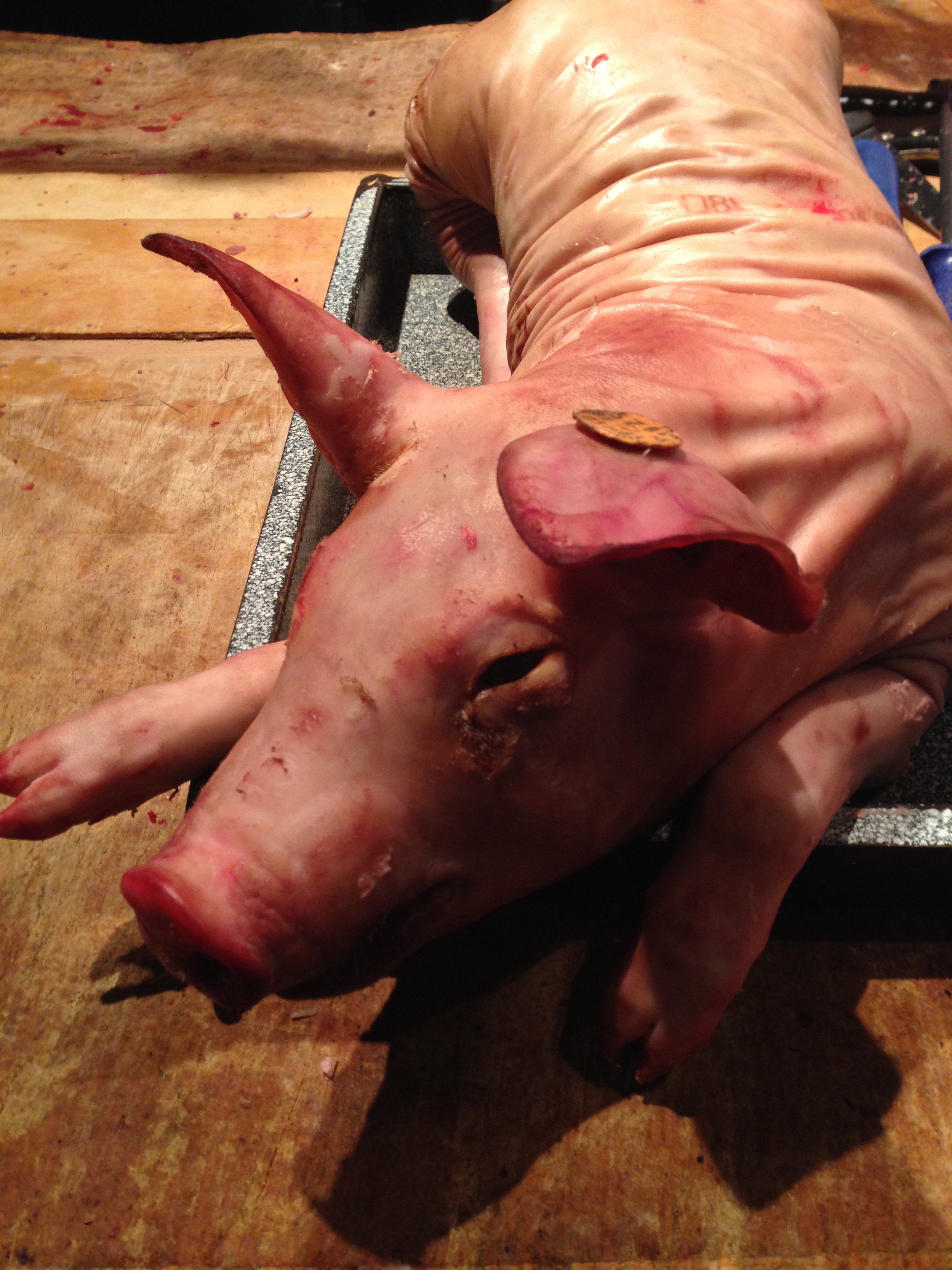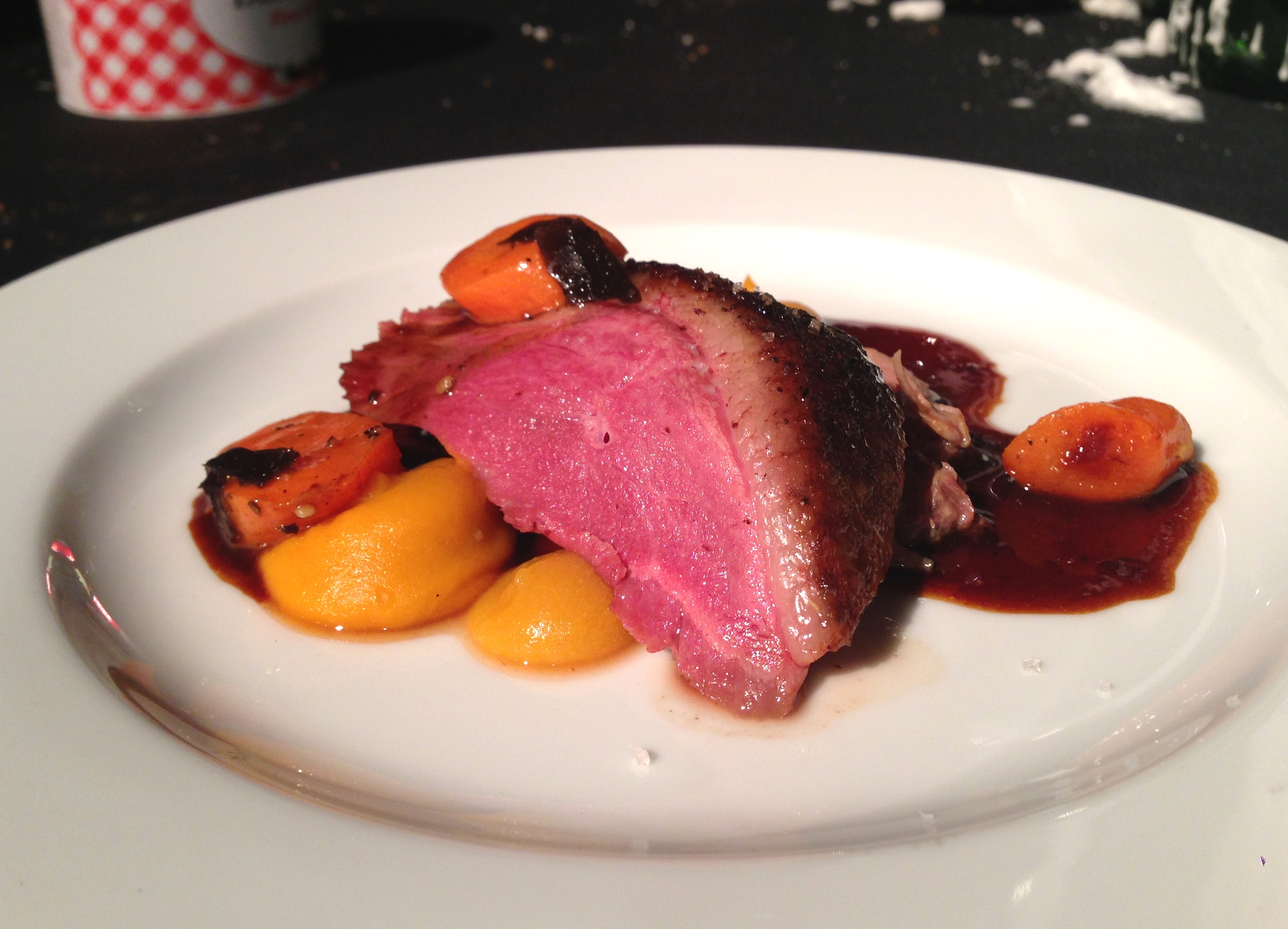 Na deze hapjes die we eerlijk onder elkaar verdelen, verhuizen we van het buitenterras naar binnen om de verschillende standen van tien topchefs af te schuimen. Vooraleer we daartoe komen, worden we naar de bijzonder indrukwekkende stand van Dierendonck gezogen… Daar hangen grote stukken gerijpt rundvlees in een vitrinekast en ligt een opgevuld varkentje op het kapblok te wachten om de volgende dag in de oven te garen.