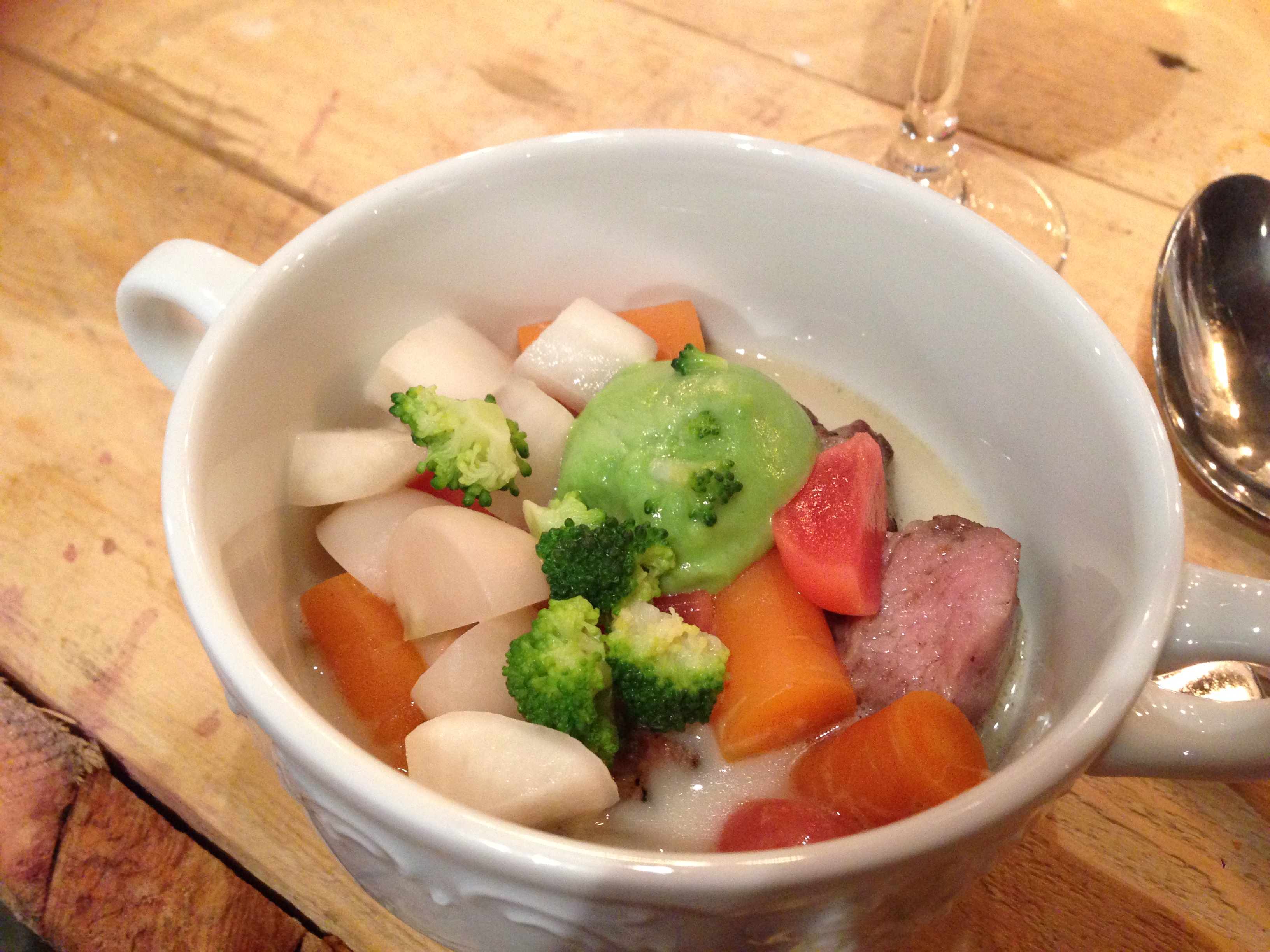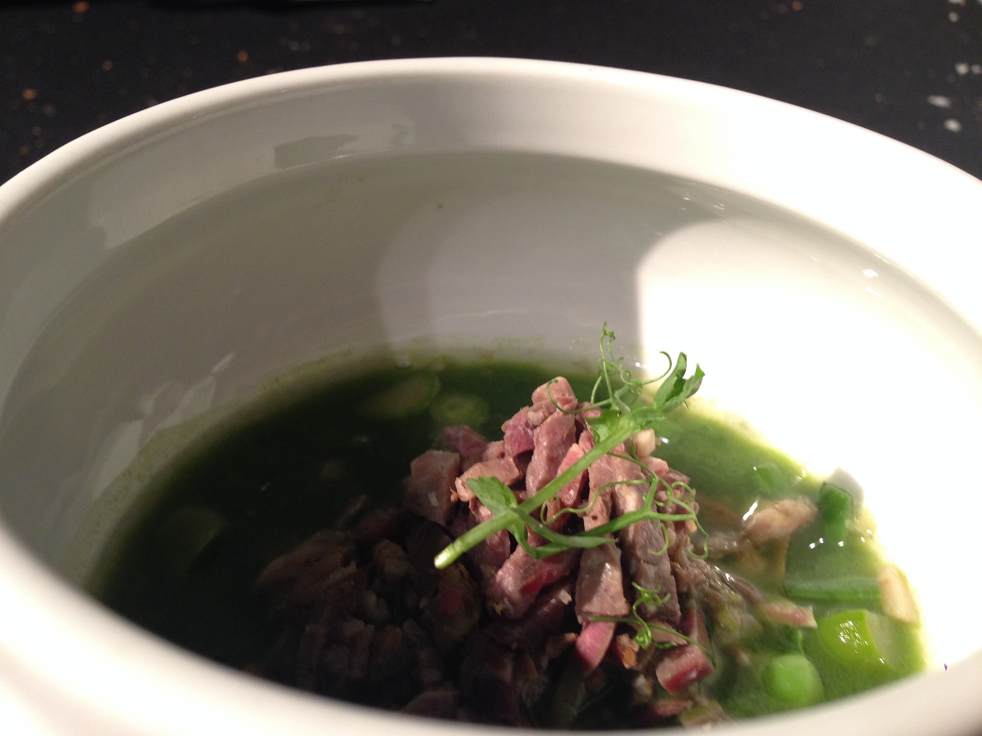 Bouillon van groene groenten en oesters, huisbereide pastrami, krokant gebak met boekweit | Julien Burlat van Dôme