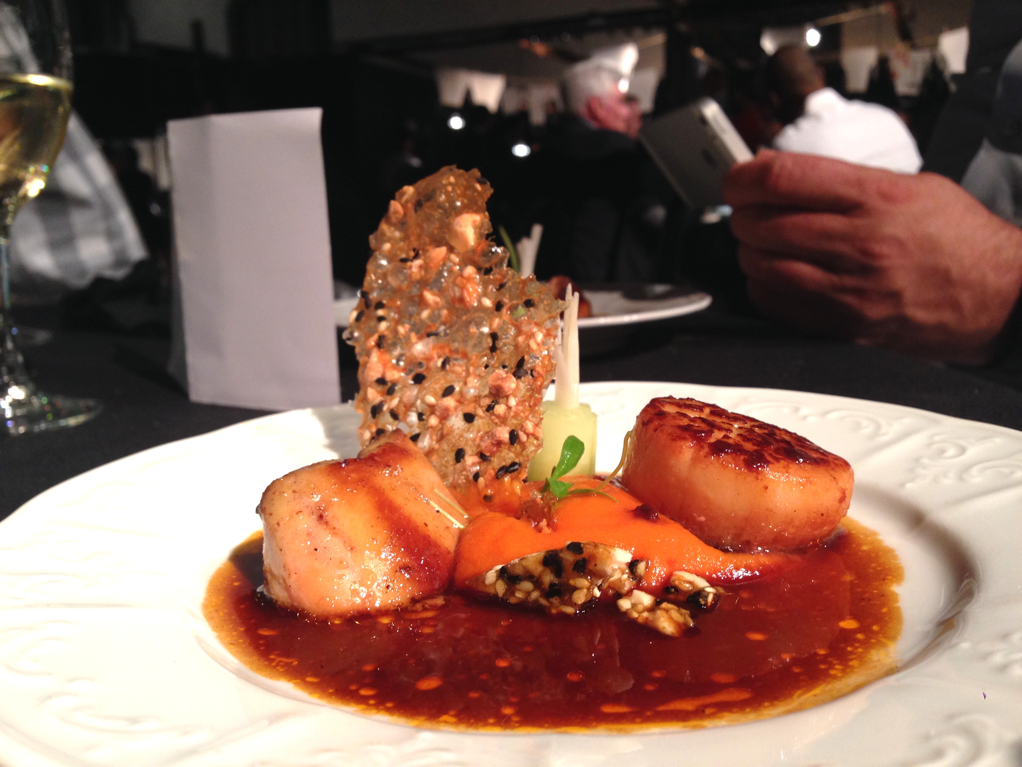Sint-Jakobsvrucht, ganzenlever, wortelmousseline, peper, gember, plumsaus, pindanoot, krokant gebakje met sesamzaad | Yves Mattagne van Sea Grill