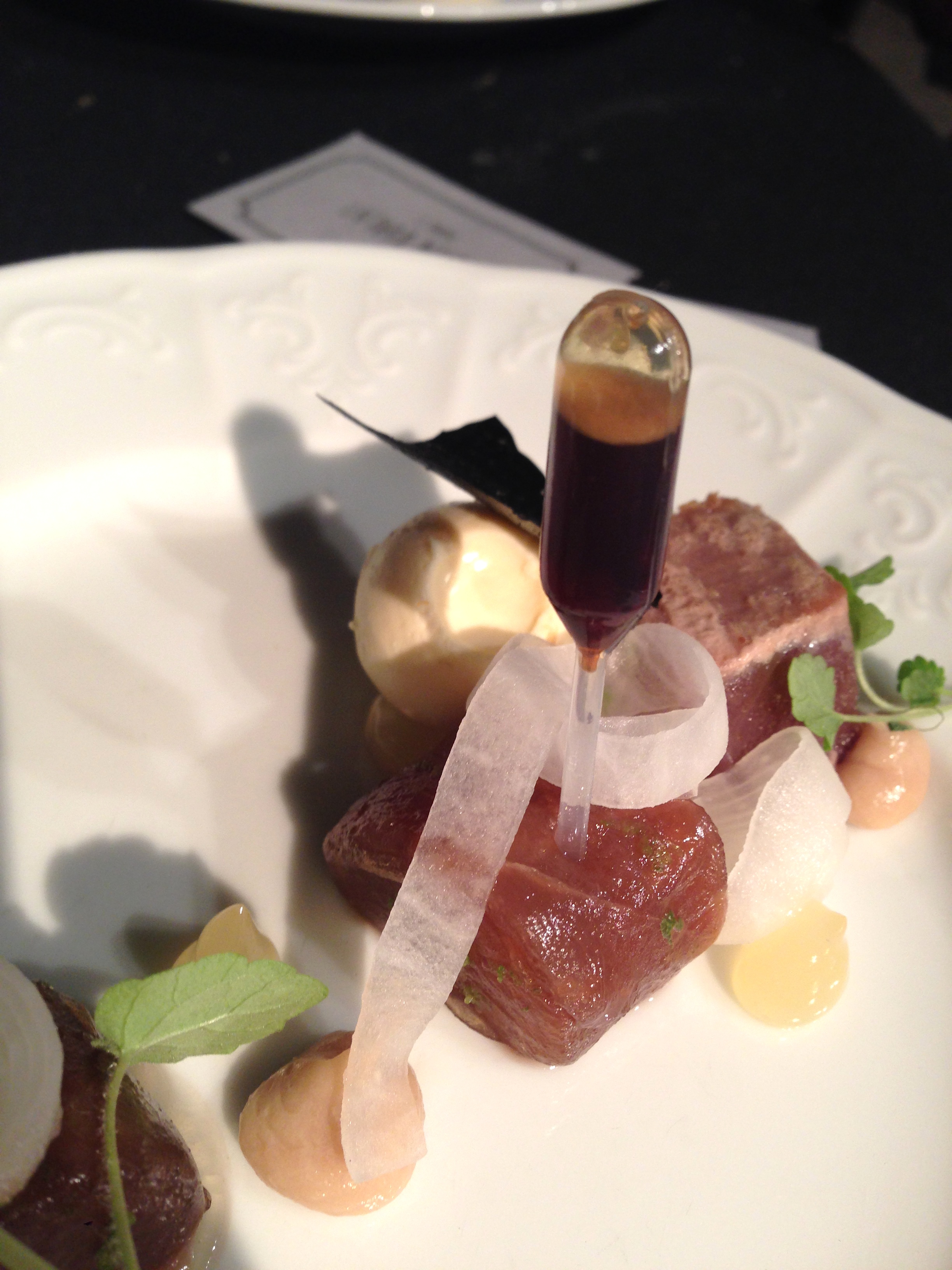 2014-05-22 19.32.35 Gekonfijte konijnenschouder, miso, aubergine, radijs