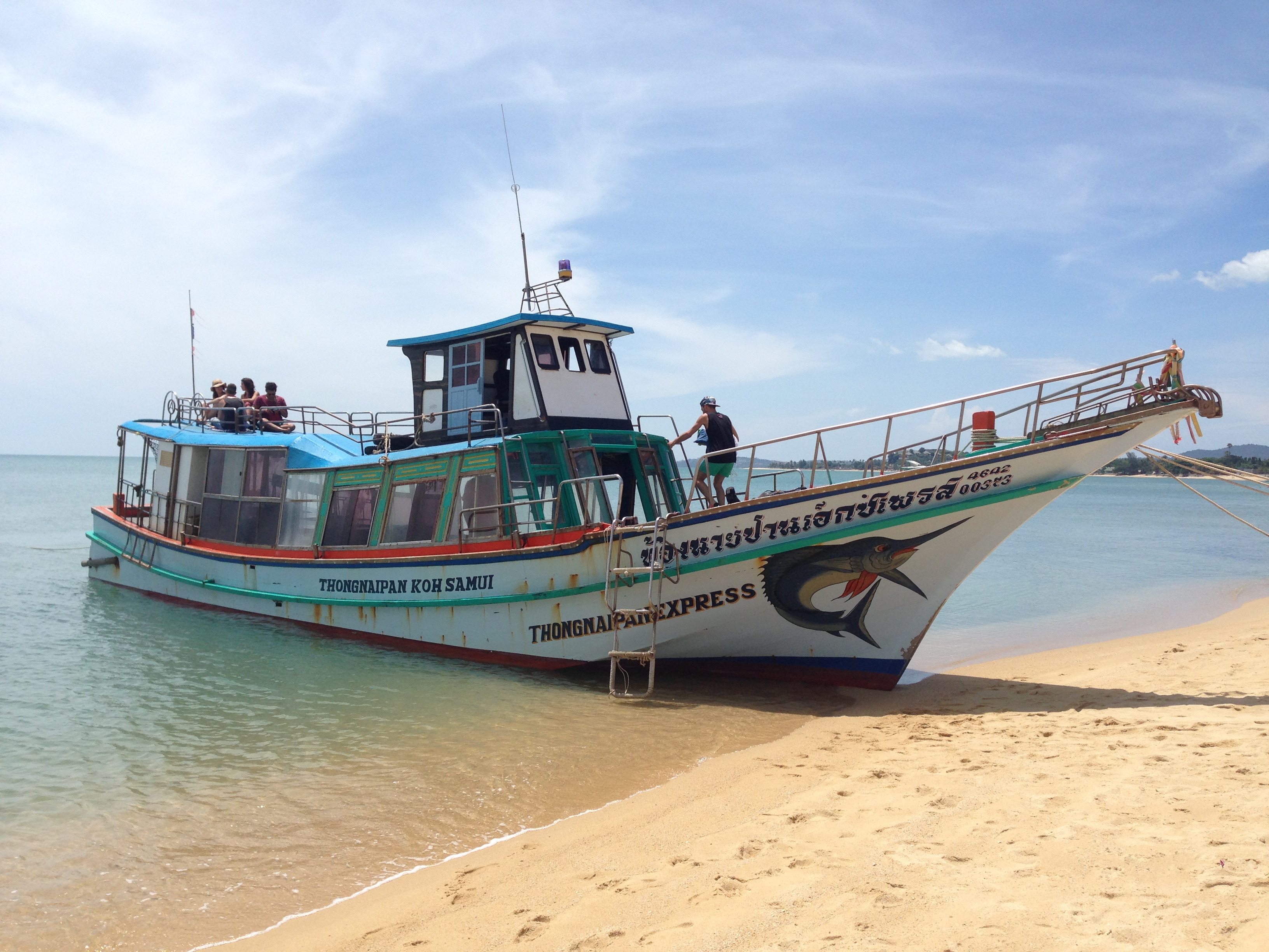 Verder kun je je à la minute verplaatsen met het vliegtuig, de trein, de bus, de minibus, de boot, de songthaew (een soort pick-up taxi), de tuktuk, de scooter, de fiets. Al deze mogelijkheden hebben we benut en met stip op één van het transportlijstje staat de scooter. Zowel in Chiang Mai, Pai, Sukhothai als op Koh Samui en Koh Tao huren we een exemplaar aan gemiddeld 200 baht voor 24 uur. Heerlijk, die vrijheid! Mijn alles-met-een-motor-lievende vriend voorop en ik met de handen rond de middel, de haren in de wind. Zolang je op asfalt en dergelijke blijft, is er absoluut geen probleem. Wanneer we het binnenland van het zuidelijke eiland Koh Samui in trekken, gaat het echter een beetje fout. De baantjes worden smaller, steiler, hobbeliger en keihard onverhard. Dankzij de stuurkunsten van de wederhelft komen we er zonder kleerscheuren vanaf. Na een paar uur rondrijden komen we terug uit op het punt waar we van de kustweg zijn afgeweken! En dat was allesbehalve de bedoeling… :)