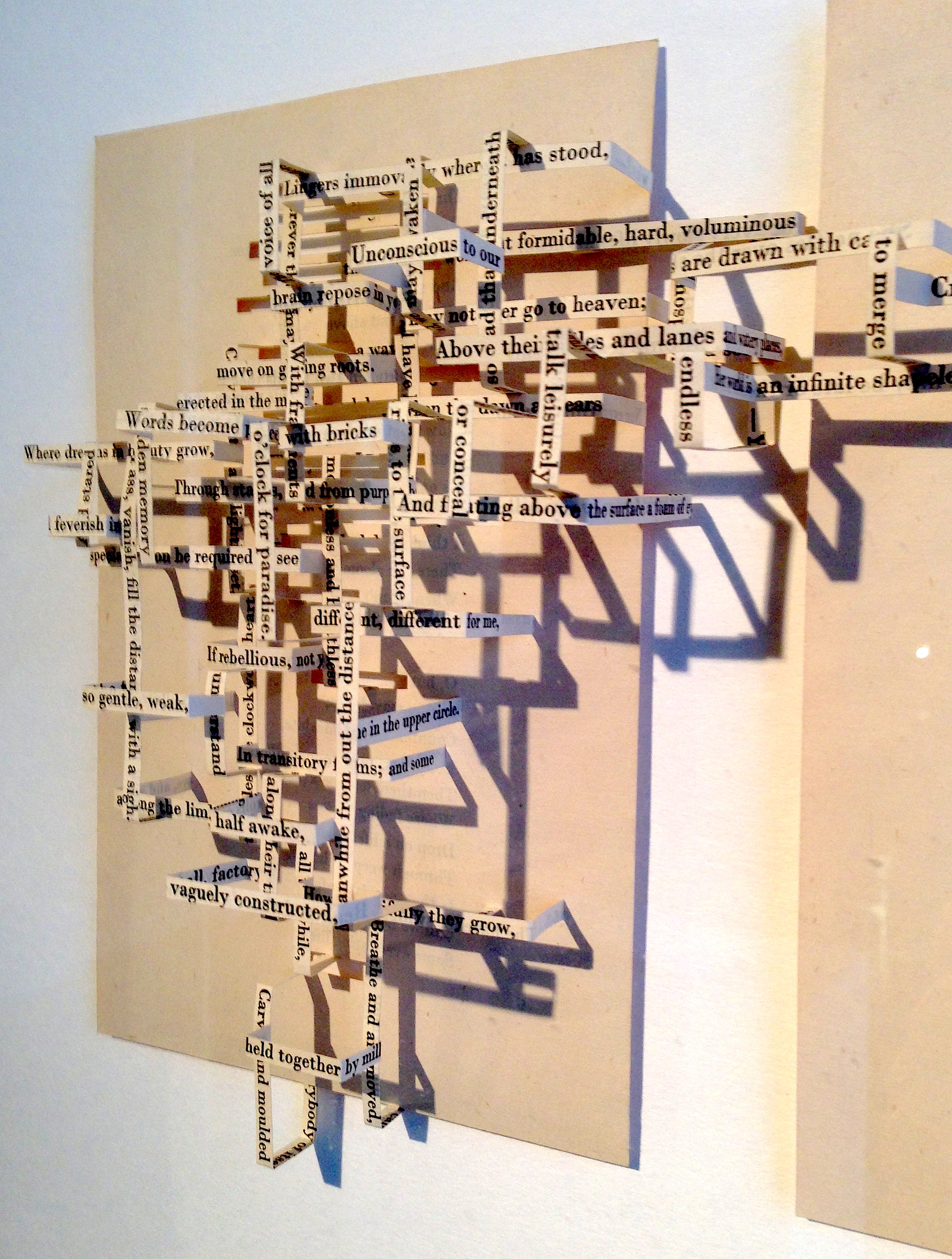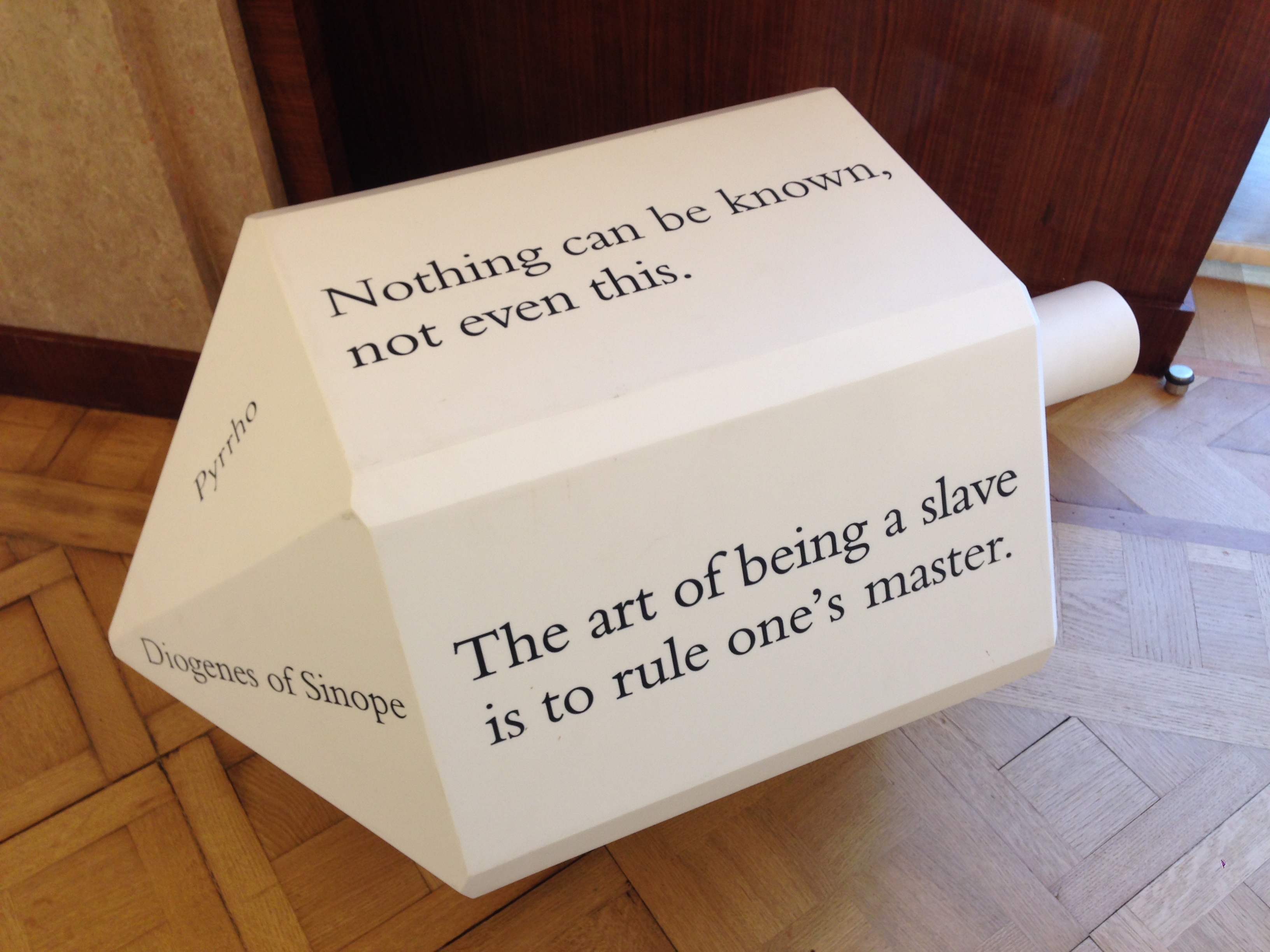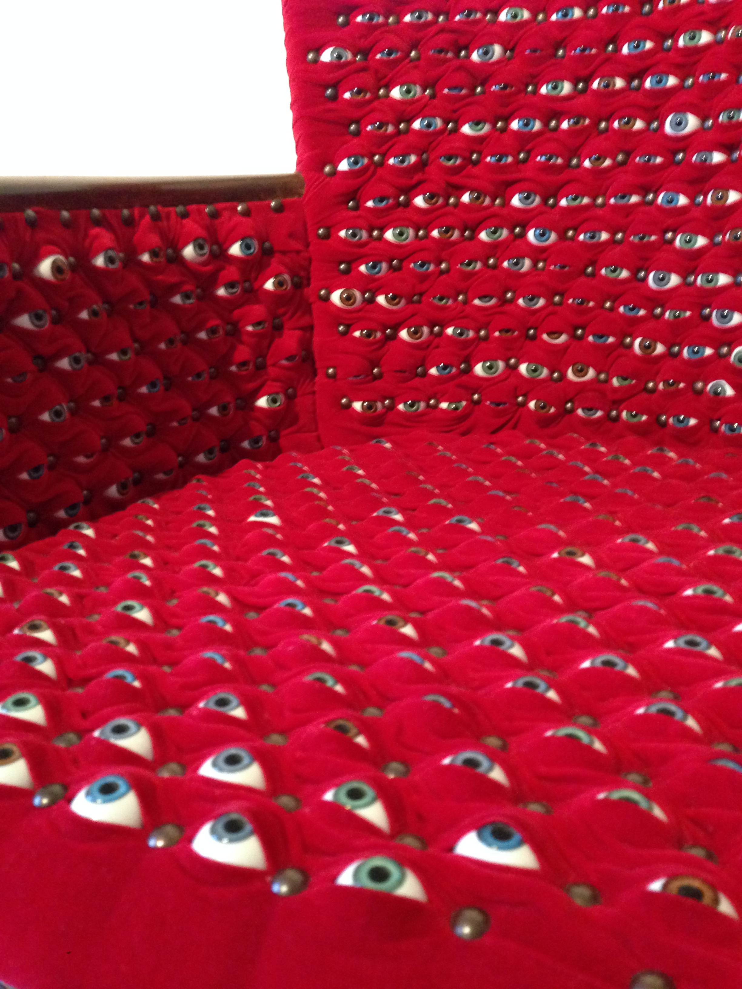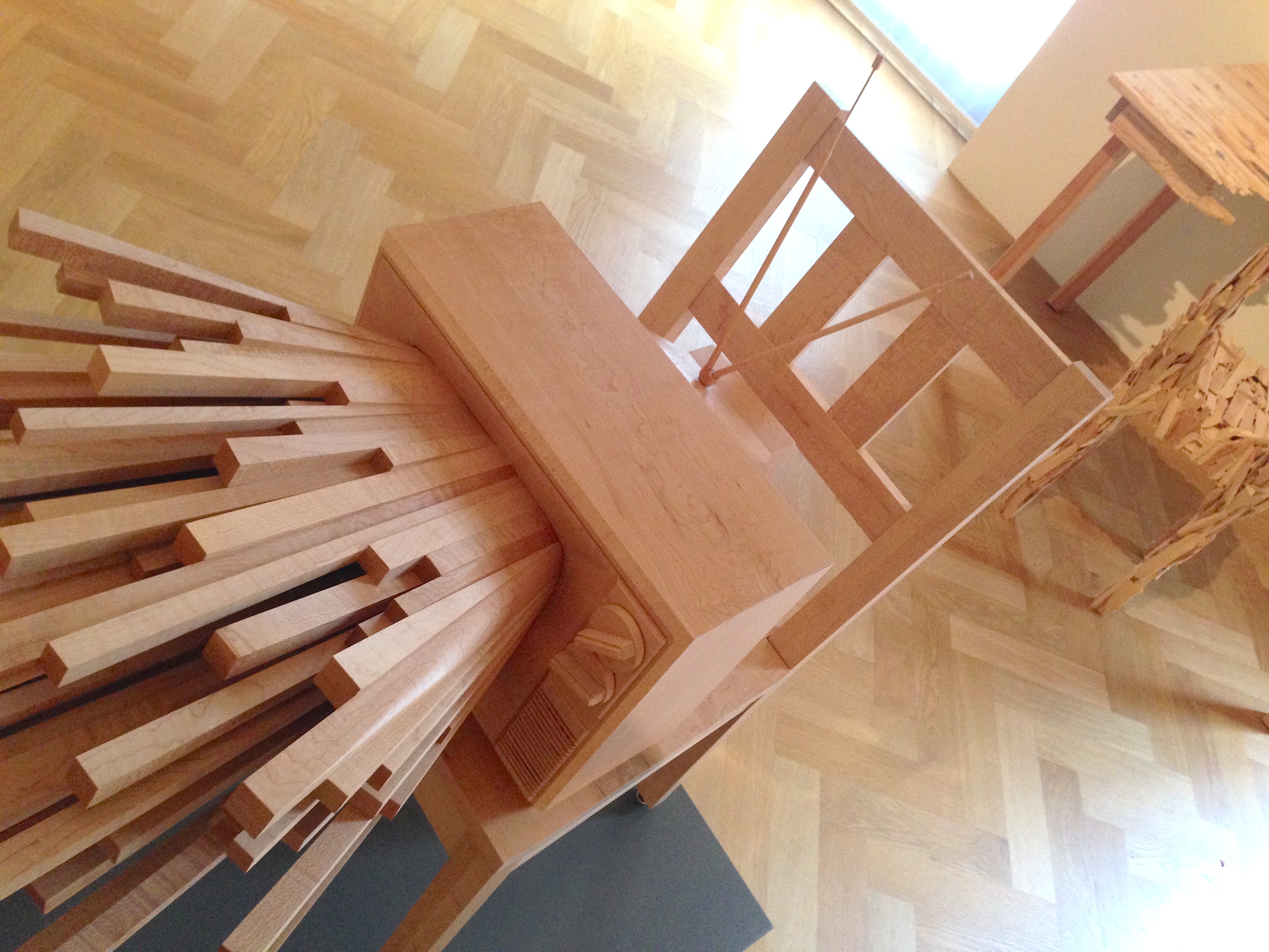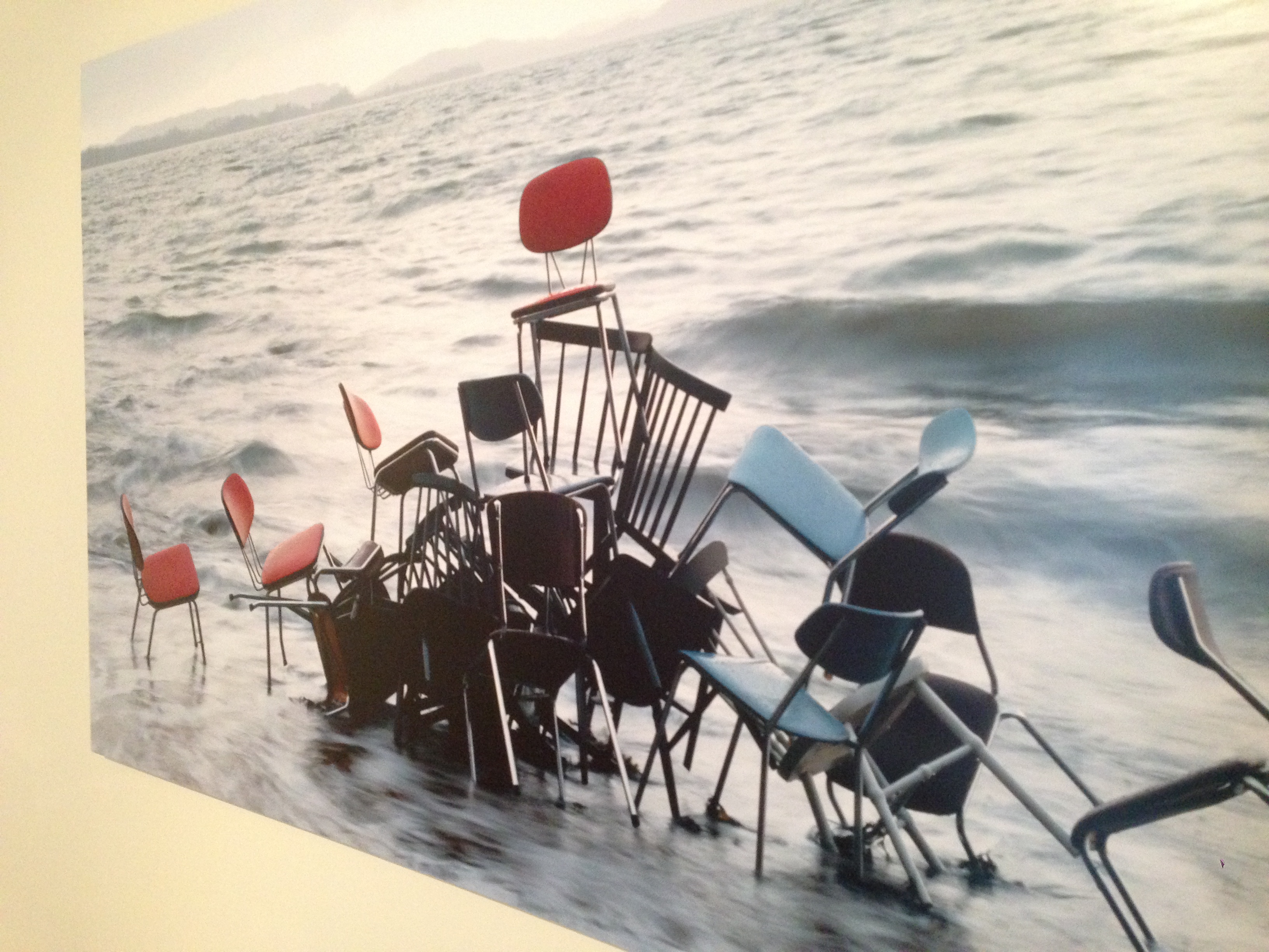 De tentoonstelling bevalt mij inderdaad. Geen grote namen, wel keer op keer werken die mij doen glimlachen. Stoelen als bomen, met veiligheidsspelden, siamese gevallen, zetels met ogen. Boeken met stukken uit gesneden, ‘surplus’ en ‘value’ uit Das Kapital geknipt. Stuk voor stuk de moeite waard om even bij stil te staan en dan nog in zo’n kader.