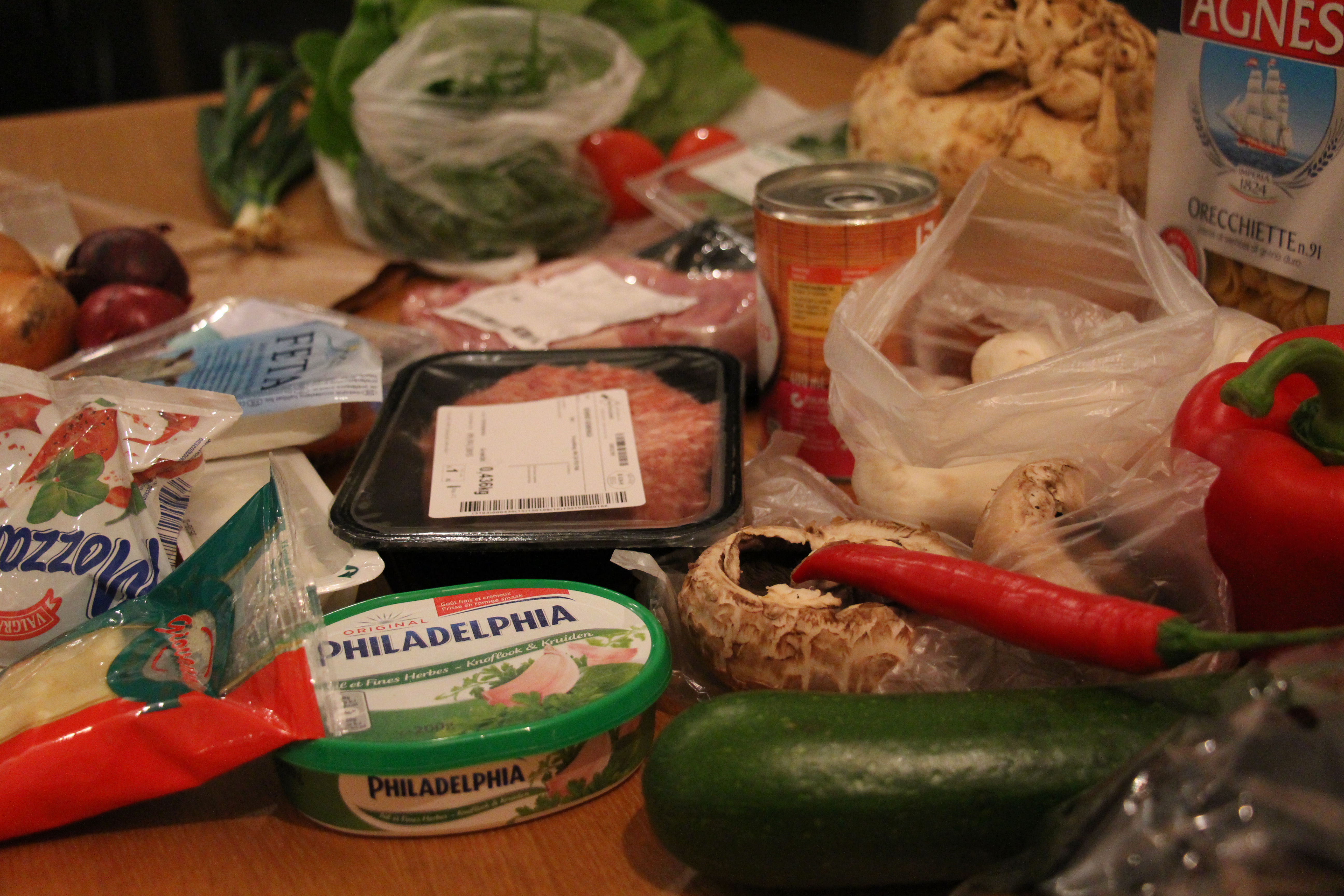 Kwaliteitsvolle en verse ingrediënten, allemaal mooi verpakt in bruine papieren zakken en dergelijke. In het oog springen de varkenskoteletten en de versheid van de groenten.