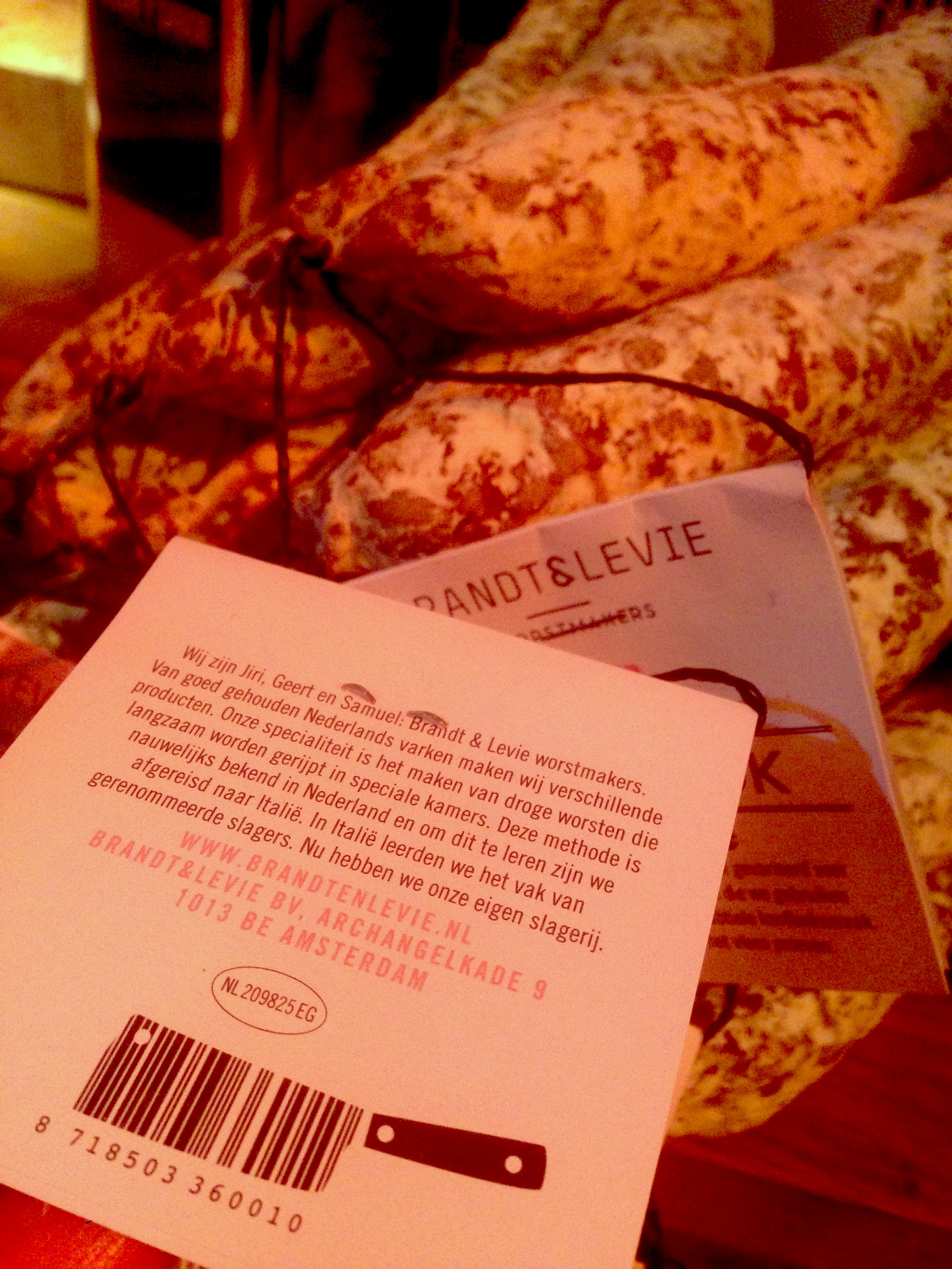 Bordje charcuterie van Brandt & Levie, gekend om z’n droge worsten en geniale barcode