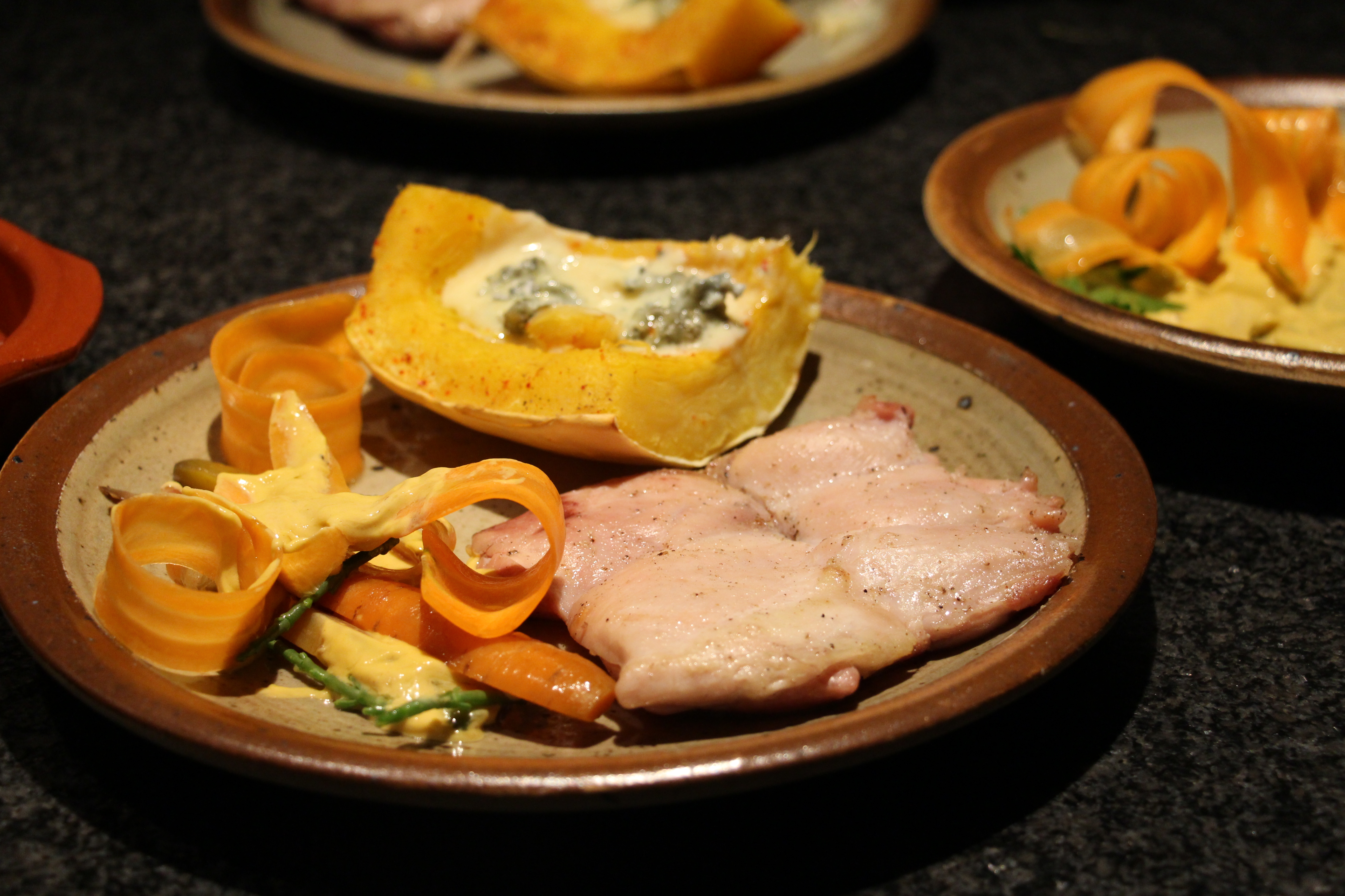 Bij het hoofdgerecht slaag ik er niet in om een mooi ogend bord samen te stellen met de kip, de wortel en de pompoen. Maar wie maalt daar om als de smaken opnieuw zo top zijn? De pompoen heb ik misschien wel wat te kort in de oven gezet, want hij blijft iets té beetgaar en de kaas loopt niet echt. De kip smaakt simpelweg verrukkelijk: je proeft de barbecue meteen, alleen zou ik het vlees een volgende keer snel nog even in een grillpan gooien om er iets minder als een rozig babypoepje uit te zien.