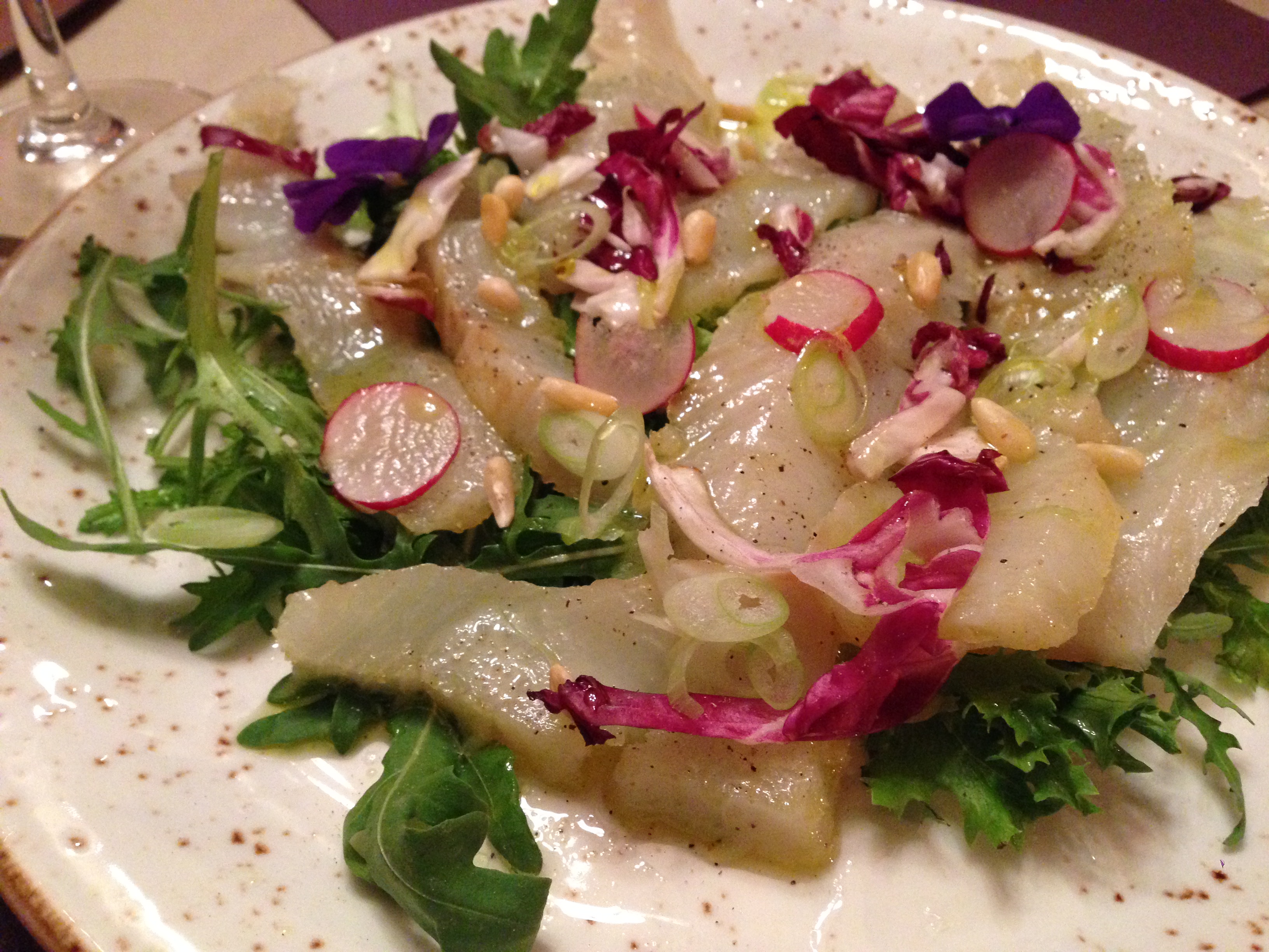 Als voorgerecht stel ik voor om de carpaccio van in korianderzaad gezouten heilbot (€ 15,80) te delen. Zowel mijn meneer als de gastvrouw van Le Baccanti gaan akkoord! Op het krijtbord worden een aantal wijnen per glas gesuggereerd. De jongedame weet duidelijk waarover ze praat als ze ons wijnadvies geeft. We starten beiden met een glas witte wijn: de natuurlijke laten we links liggen en zo komen we bij een licht verteerbare waarvan ik alle details vergeten ben. De keuken bevindt zich op het eerste verdiep; via de open trap en het houten plafond kunnen we als het ware het bereidingsproces op basis van de geluiden volgen. Dan komt het bord met onze starter naar beneden: de olijven verdwijnen van tafel en er komt een mandje echt lekker brood in de plaats. Het aanbod om elk een apart bord te krijgen, slaan we af.