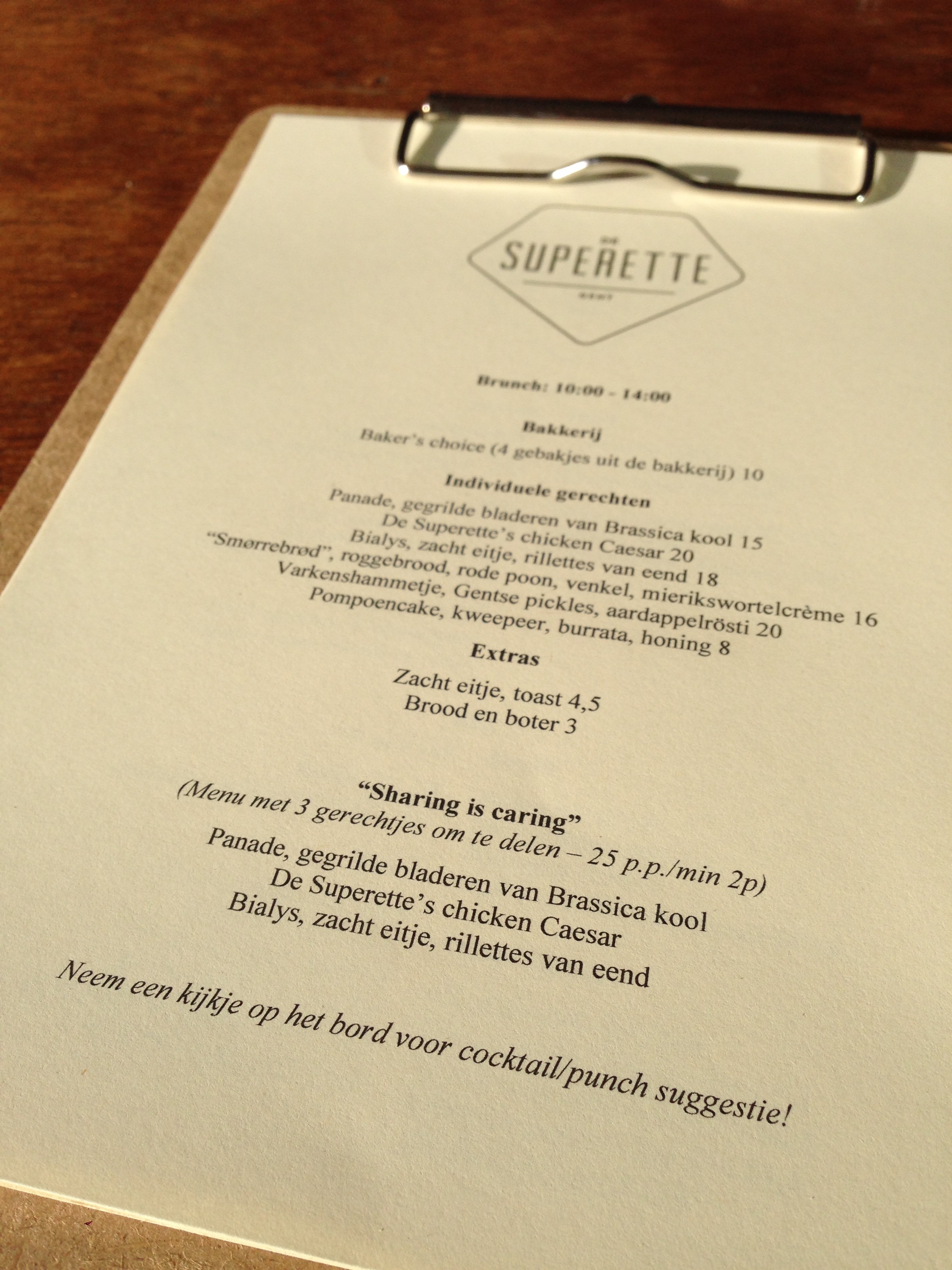 De zonnige nazomerdag in oktober leent zich perfect voor het overdekte terras. We installeren ons op een plekje waar de ochtendzon ons kan vinden en krijgen snel de menukaart voorgelegd. Tijdens het weekend kun je bij De Superette nu ook brunchen van 10 tot 14 uur. Ik voel me nog niet wakker genoeg om mij al op pakweg een varkenshammetje te storten, laat staan om voor het “Sharing is caring” concept aan € 25 per persoon te kiezen. Bovendien ben ik niet van plan om meer dan € 50 aan deze Superettesessie uit te geven, dus neig ik eerder naar de echte ontbijtdingen.