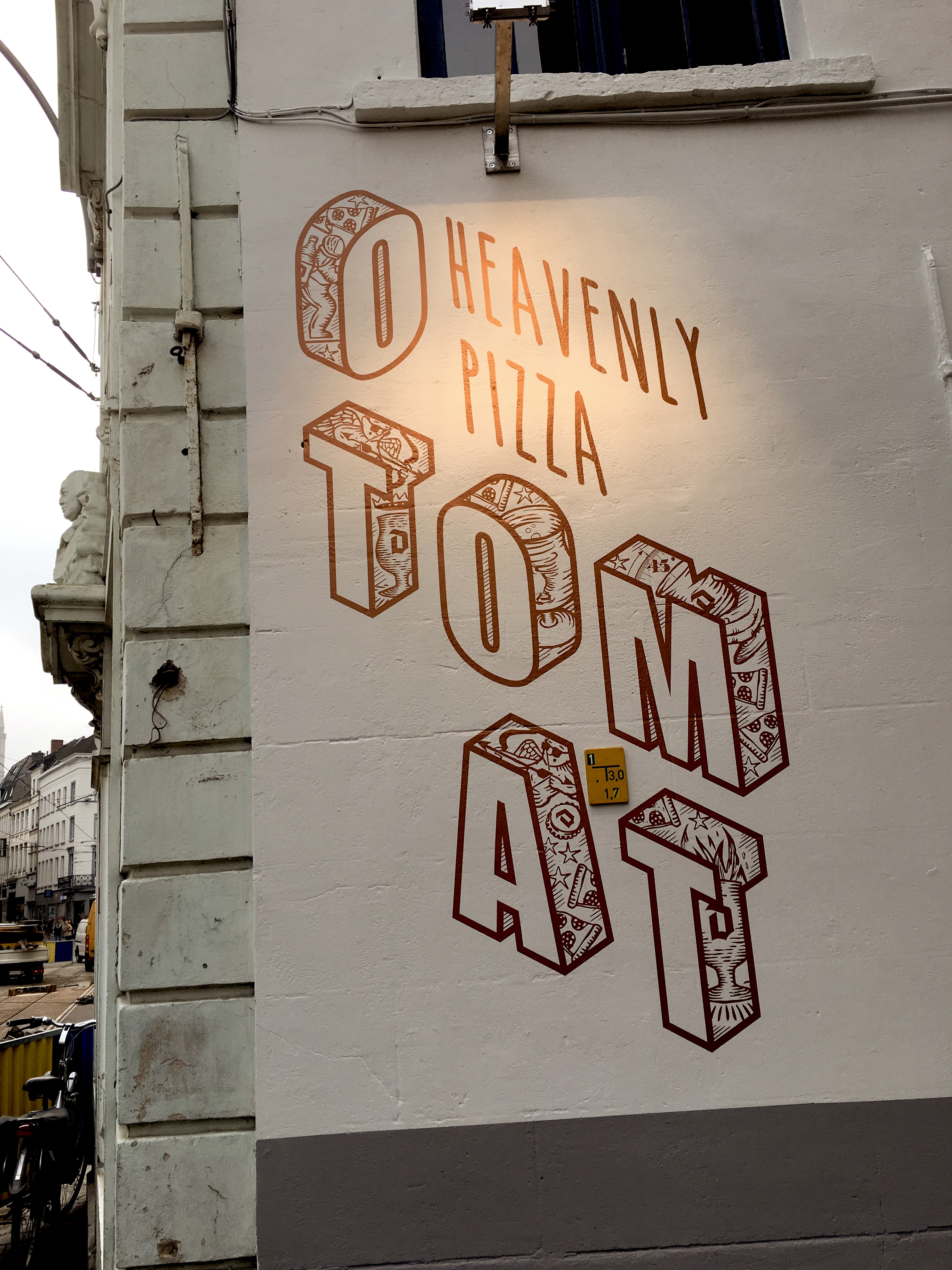 Over Otomat Antwerpen hoorde ik de laatste jaren niets dan goeds, meer heb ik niet nodig om kort na de opening van Otomat Gent naar de Kleine Vismarkt te trekken. Euhm, hebben we een Kleine Vismarkt in Gent? Google Maps to the rescue! Het blijkt dat (toeristische) stukje tussen het Gravensteen en de Groentenmarkt te zijn, waar ze momenteel de brug vernieuwen… Dat brengt mij meteen bij het punt dat hun start zeker niet ideaal genoemd kan worden, want je moet toch even speuren langs Heras-hekkens vooraleer je deze muurtekening ziet.