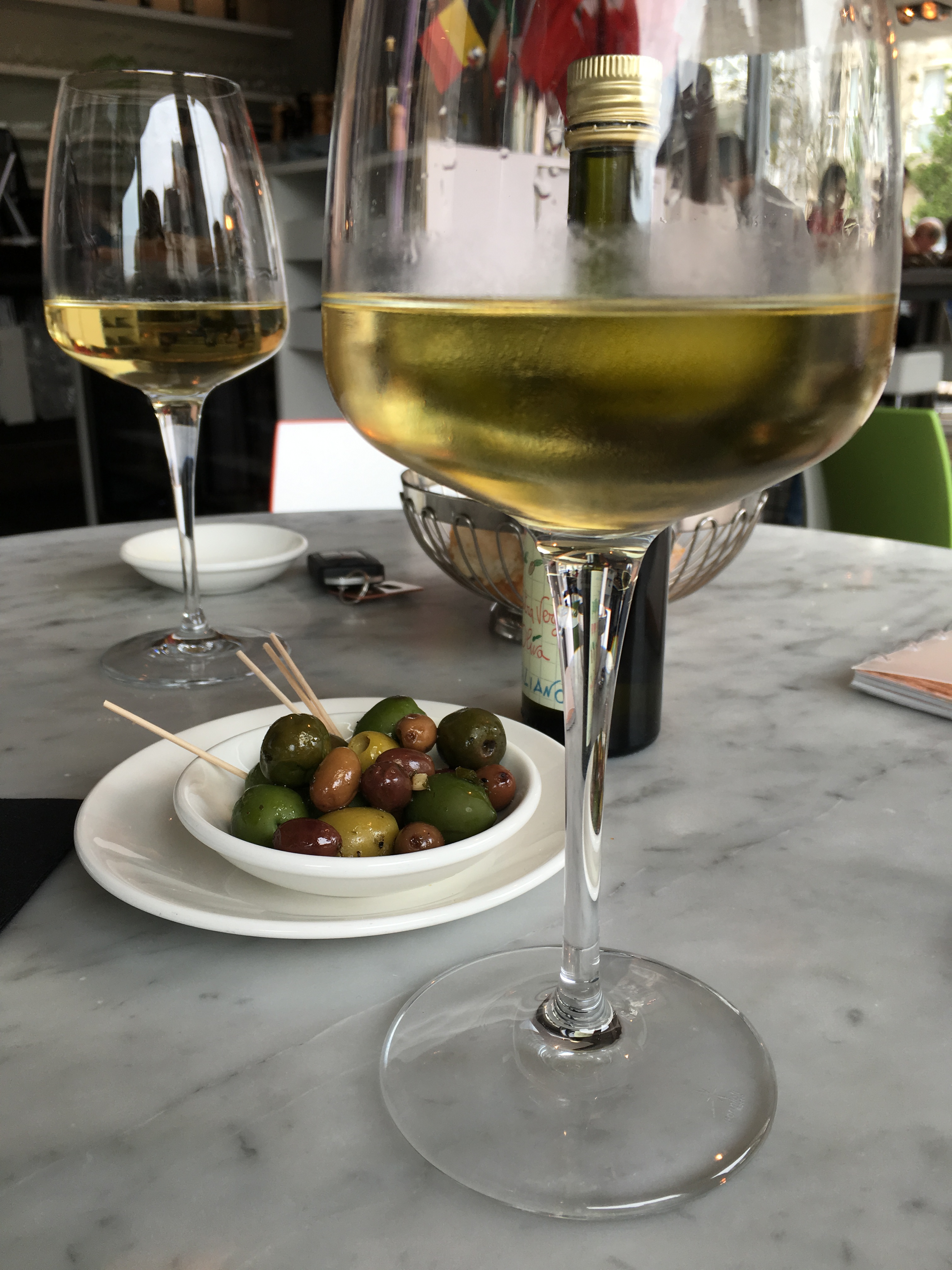 Ondertussen slaat de klok 13u30. We beslissen om niet te aperitieven met bubbels, maar een Verdicchio (€ 6) van de wijnkaart te selecteren. Een prima keuze, besluiten we eensgezind na de eerste slok! Daarbij komt een kommetje gemengde olijven van prima kwaliteit en je weet meteen dat deze olijven een voorbode van het andere eten zijn…