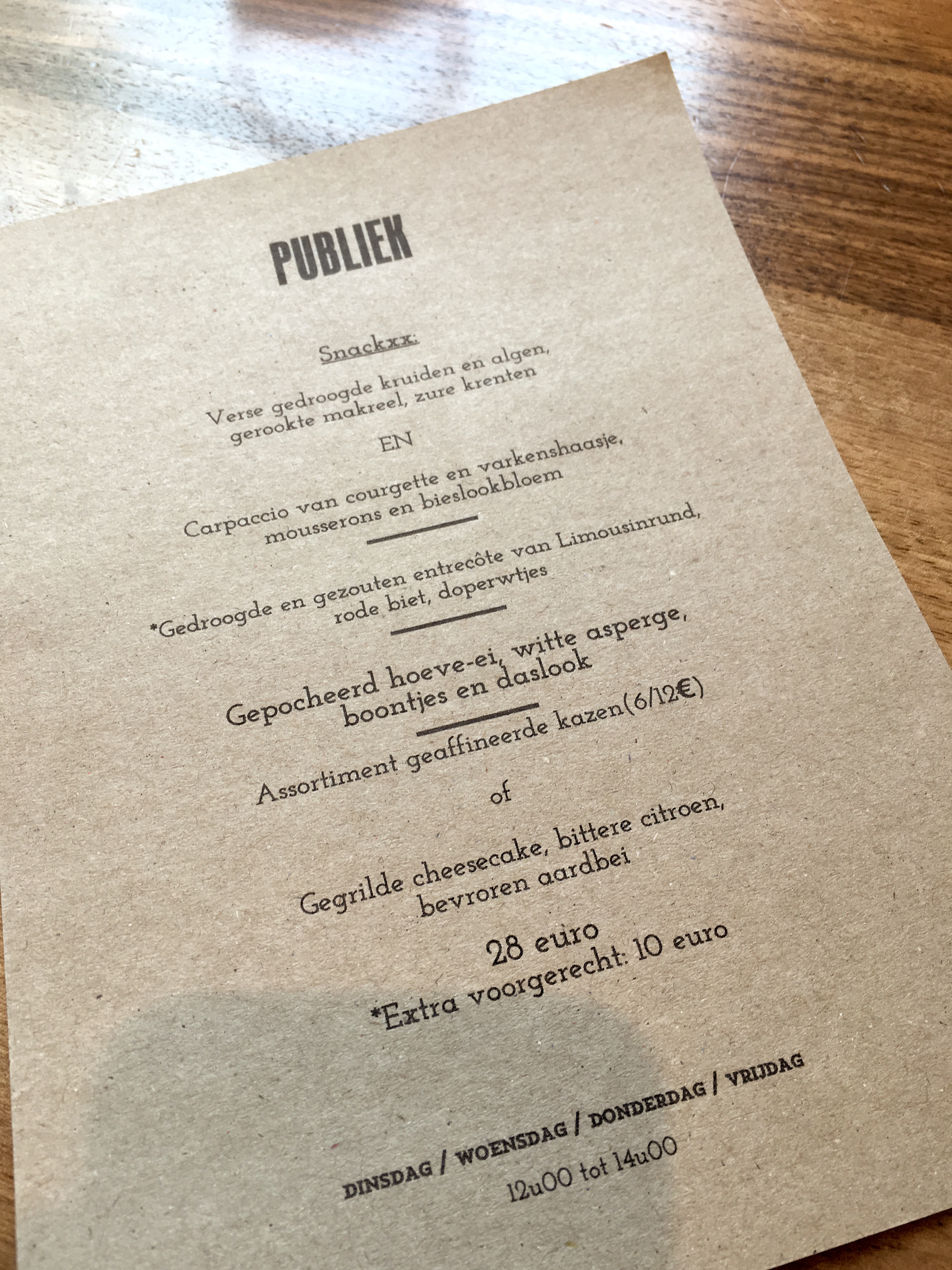 Mijn eerste bezoek aan Publiek dateert van eind januari 2014, niet zo lang na de opening. Ter gelegenheid van deze verjaardagslunch – niet voor mij, maar voor een vriendin – stap ik dus pas voor de tweede keer over de drempel bij chef Olly Ceulenaere en z’n gastvrouw Kelly in de Ham. Unbelievable but true… In die tijd beloonde Michelin hen met een ster.