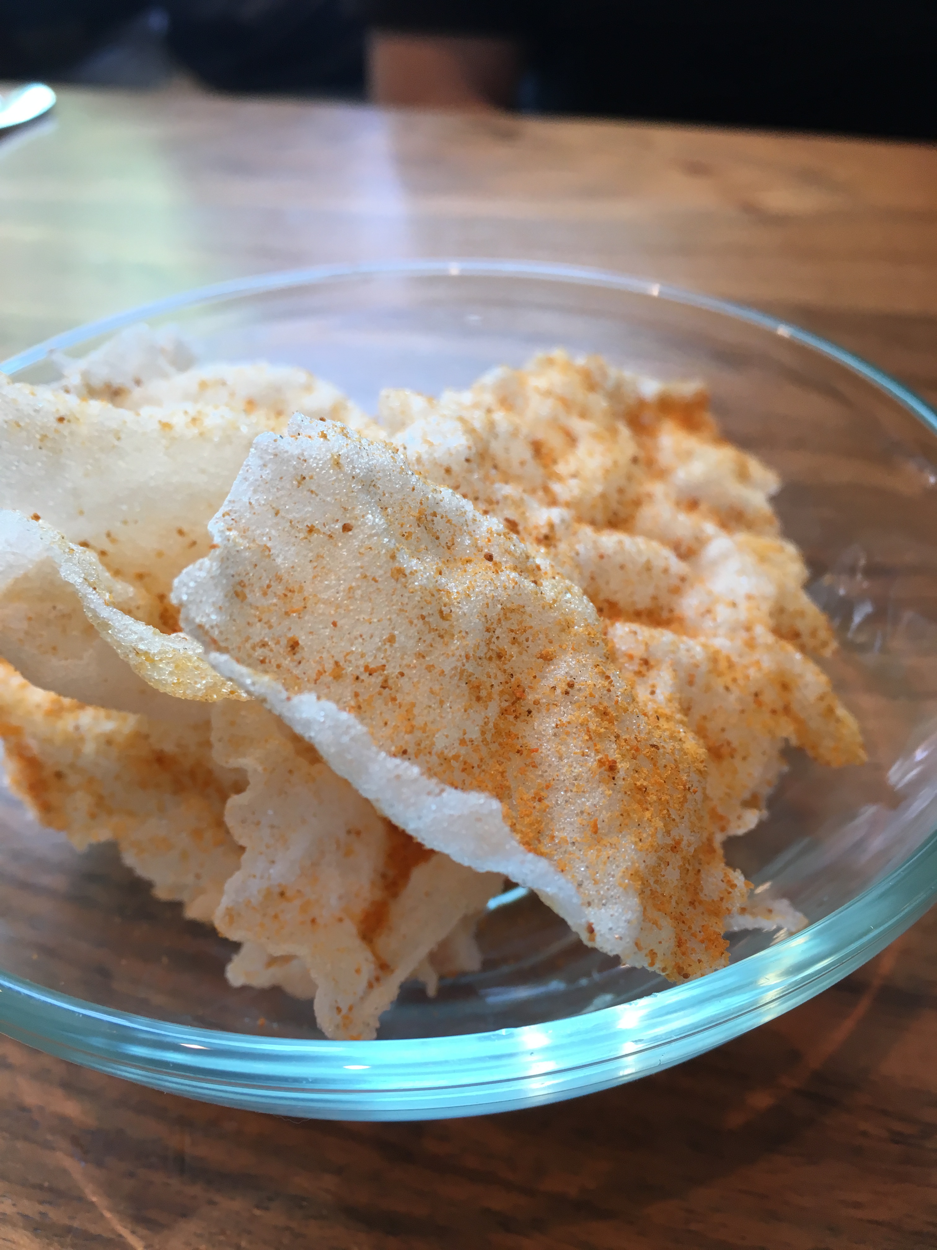 Als hapjes verschenen al niet meer helemaal krokante crackers – een afknapper dus – met hummus en groene olijven. Het kader (het interieur, de kommetjes, het bestek) en de bubbels maken totnogtoe meer indruk dan het eten. Benieuwd of die lijn zich verderzet!