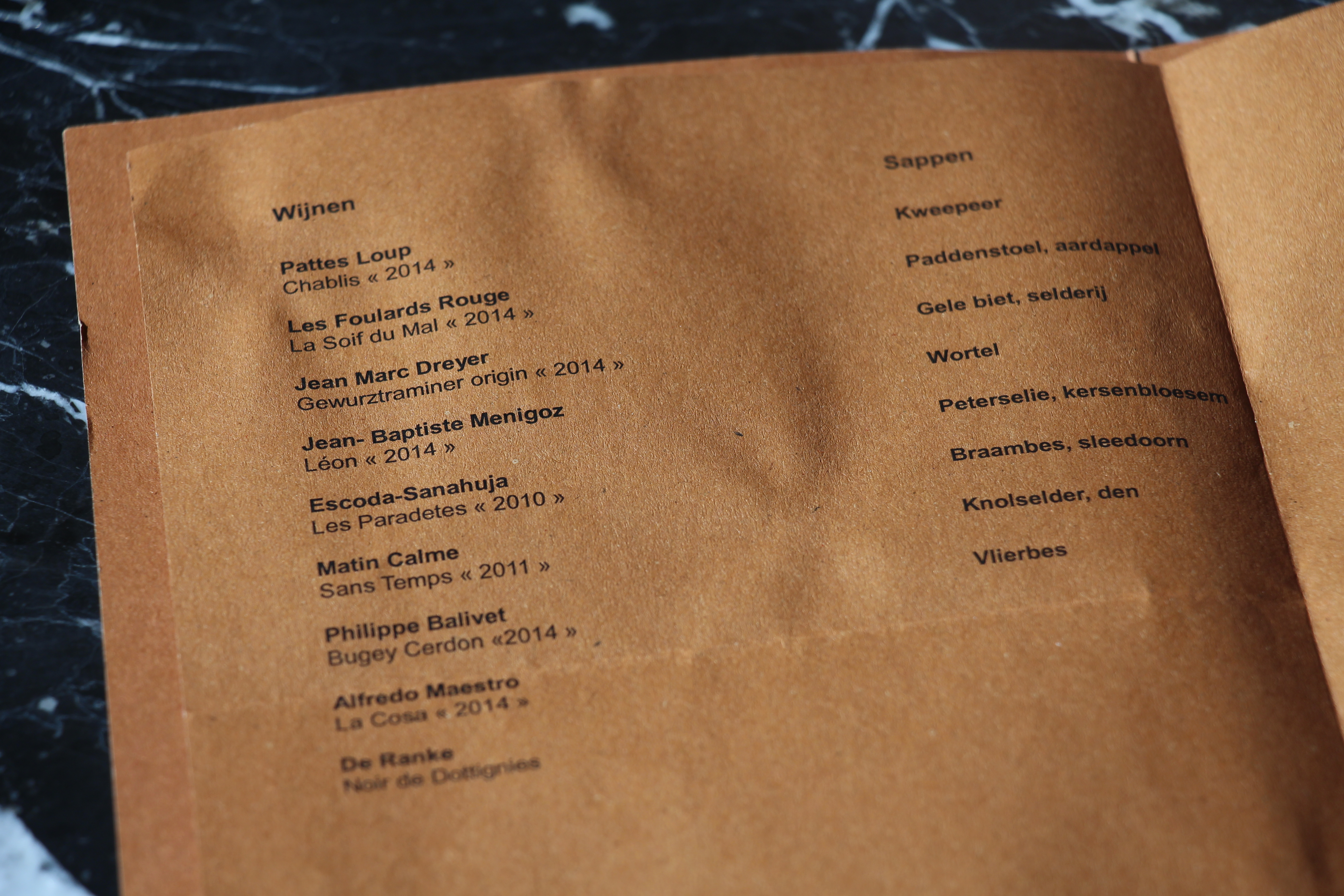 Het is zaterdagavond, de zaak zit mooi gevuld en we krijgen een ruime tafel in een akoestisch minder deel van de zaak. De eetkeuze bestaat uit à la carte, twee, drie of vier gangen. Het menu wordt samengesteld uit de kaart. Ze willen de gerechten verklappen, wij verkiezen de verrassing. En doe maar de gulden middenweg: drie rondes (€ 34).