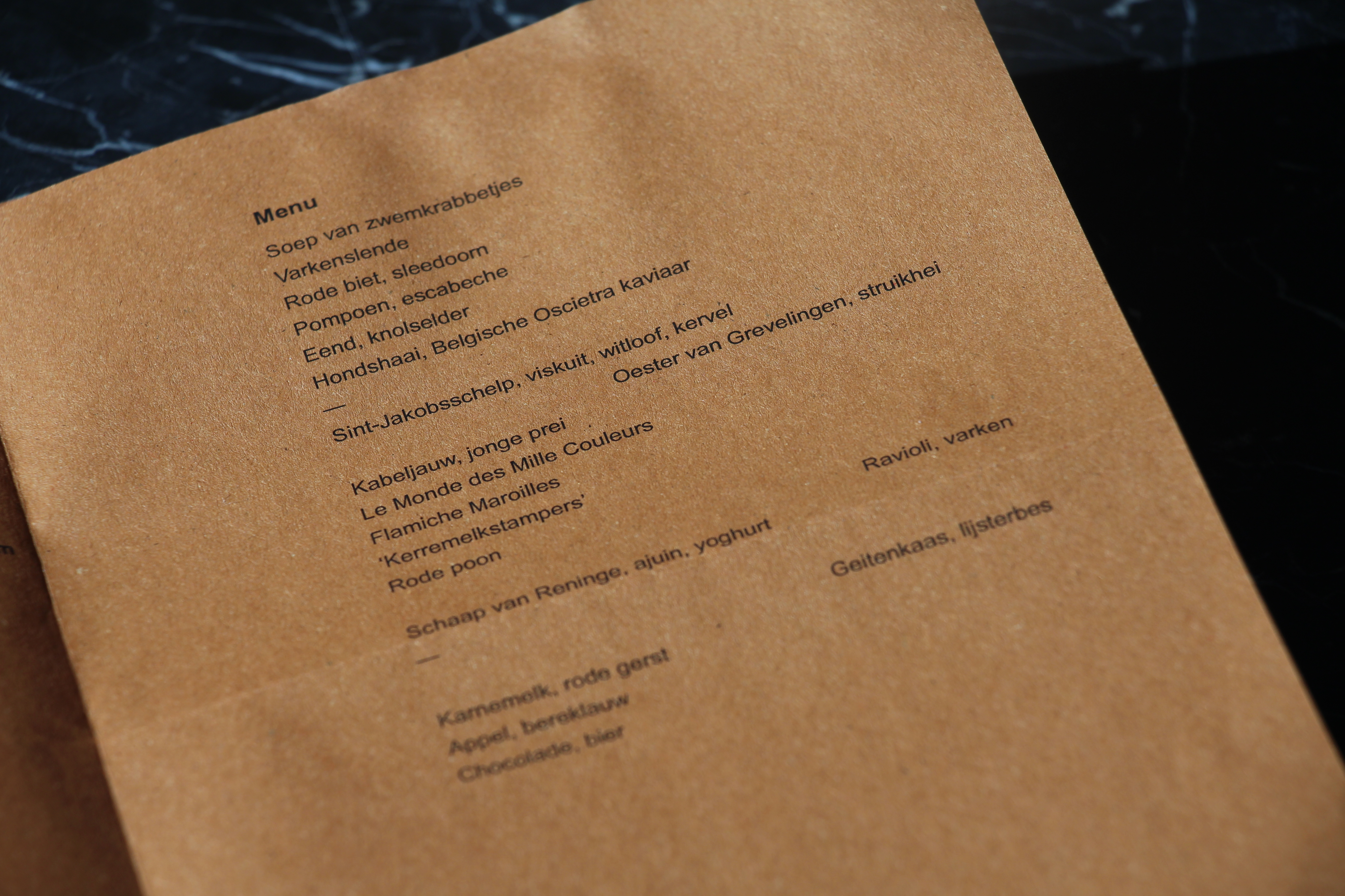 Het is zaterdagavond, de zaak zit mooi gevuld en we krijgen een ruime tafel in een akoestisch minder deel van de zaak. De eetkeuze bestaat uit à la carte, twee, drie of vier gangen. Het menu wordt samengesteld uit de kaart. Ze willen de gerechten verklappen, wij verkiezen de verrassing. En doe maar de gulden middenweg: drie rondes (€ 34).