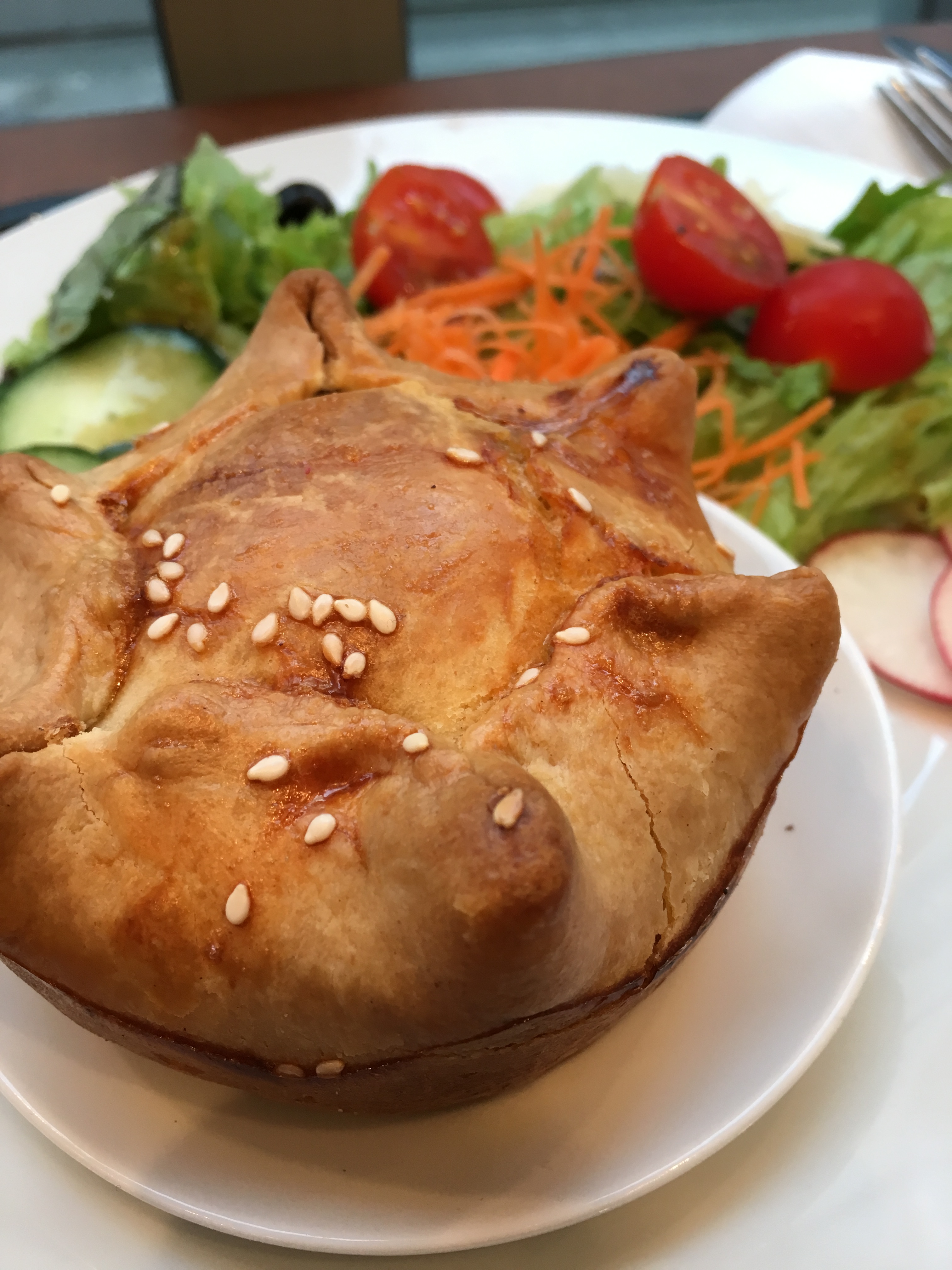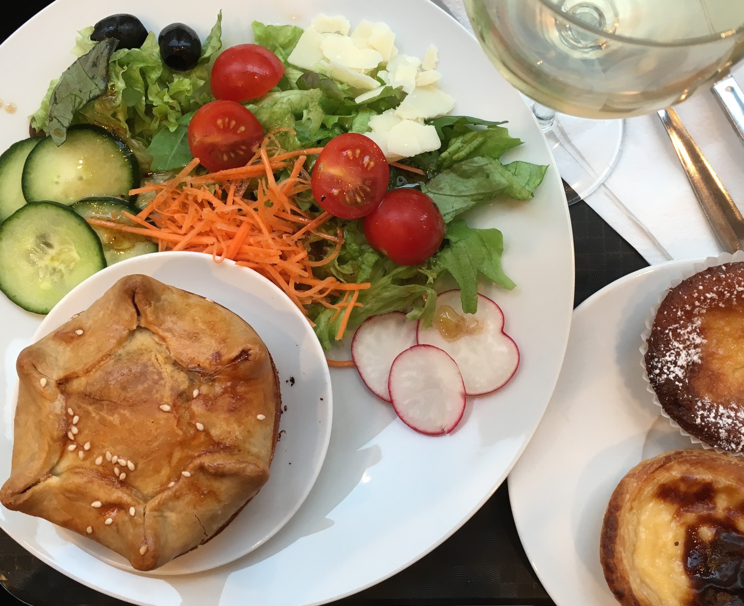 Mijn gezelschap laat even op zich wachten, dus neem ik ruim de tijd om mij met een glas witte wijn (€ 3,50) aan de toog bij het raam te installeren, wat te lezen en terwijl voorbijgangers te observeren. Inmiddels weet ik wat ik wil: empada met kip en chorizo en slaatje ernaast (€ 8,75). Daarbij lust ik nog wel een glas wijn. De collega doet van idem dito. Even melden dat de empada’s bij Beluso ook zonder slaatje gekocht kunnen worden: warm of koud, ter plekke consumeren of meenemen. Nog een geluk trouwens dat ik mijn zinnen niet op een sandwich gezet had, want die blijken uitgeput.