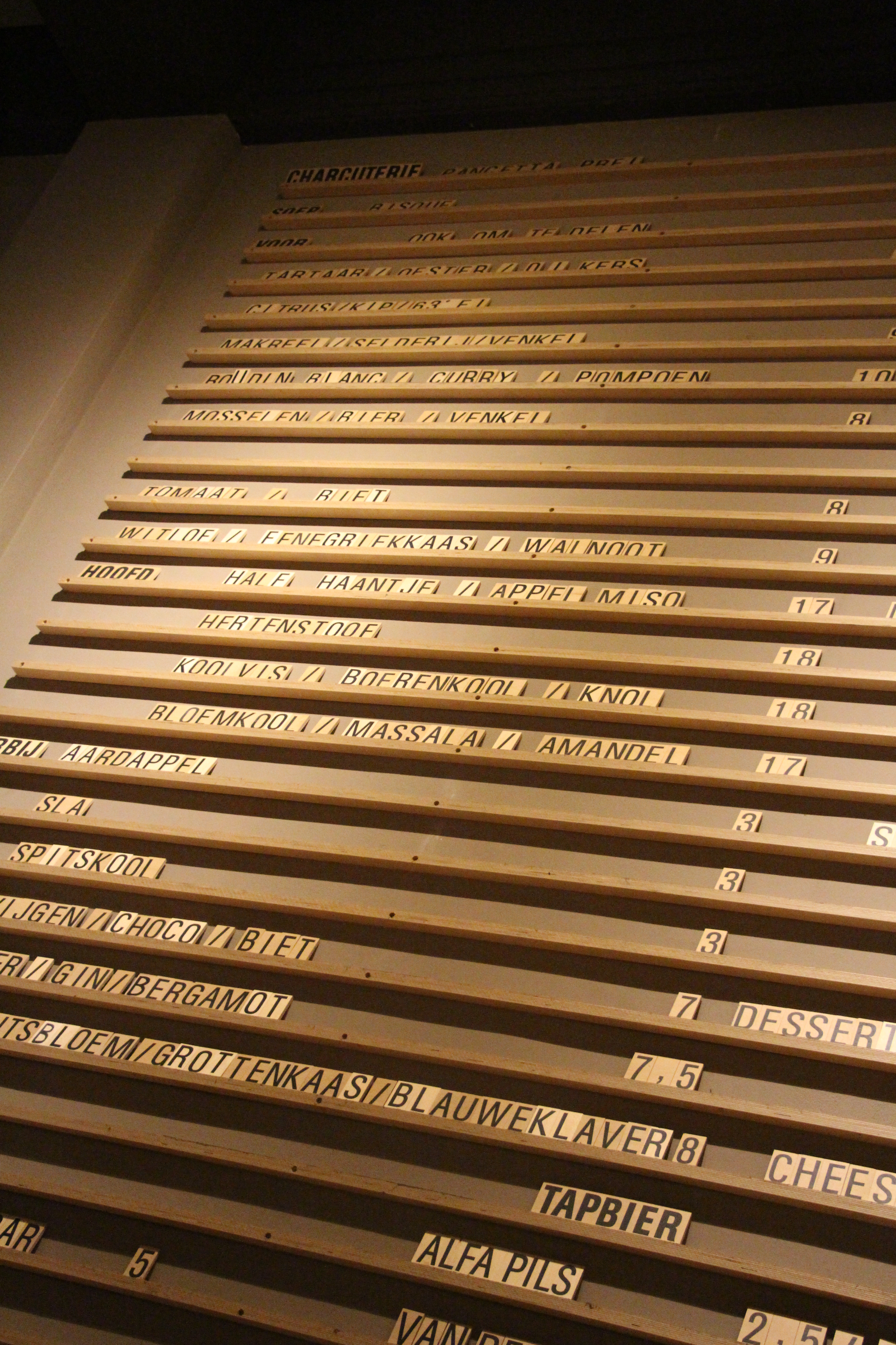 Op een zaterdagavond zonder reservatie in een levendige stad een restaurant zoeken, je mag dat gerust een uitdaging noemen. En toch ben ik zo onvoorbereid geweest om niets culinairs te boeken voor onze minitrip naar Rotterdam. Dan maar even surfen tijdens het vooravonddutje van mijn meneer, op TripAdvisor en zo meer. Ik raak gecharmeerd door Dertien en in het bijzonder door de spectaculaire muurhoge menukaart die bestaat uit individuele lettertjes op houten schappen. Echt wel een plaatje!