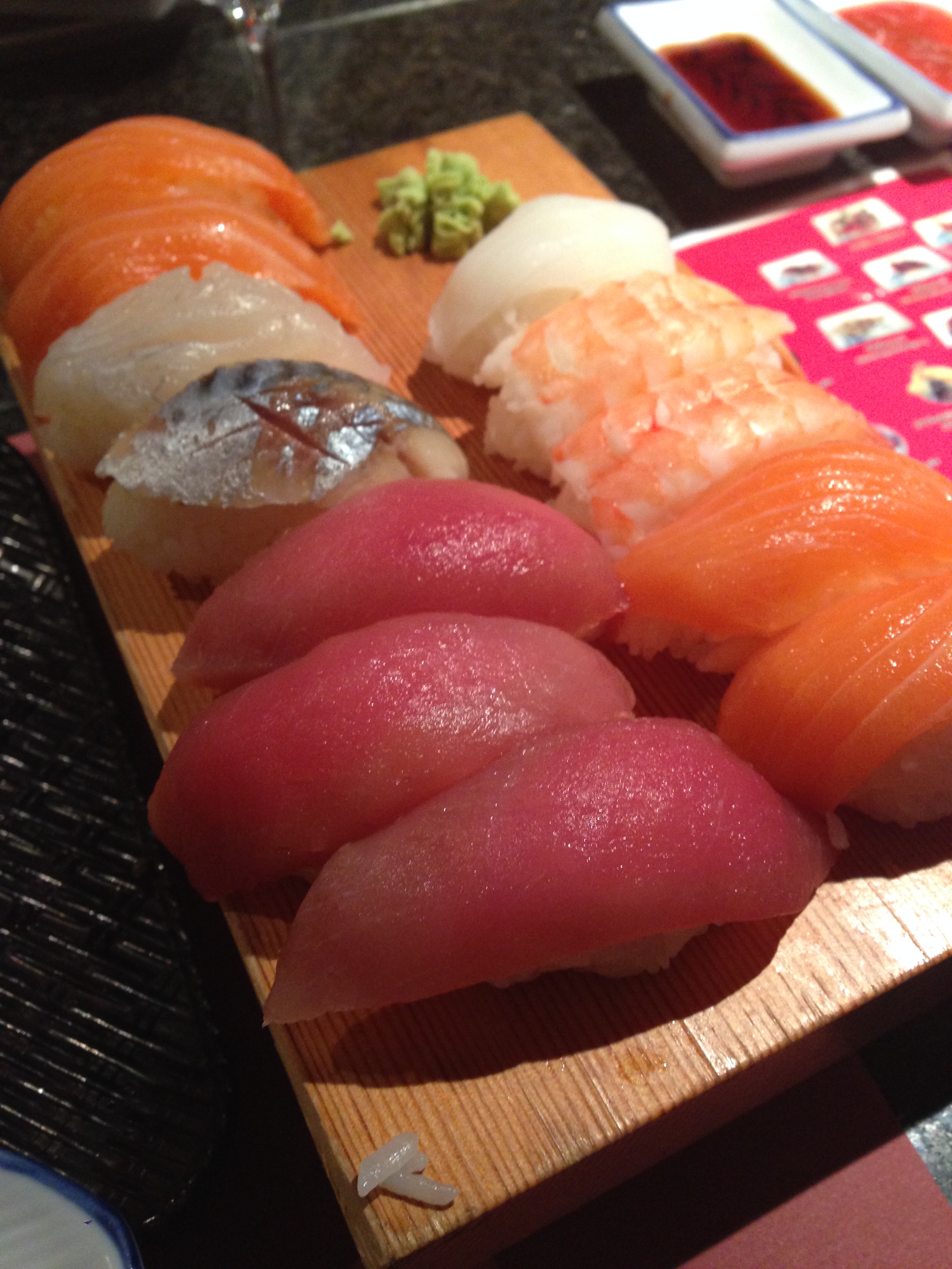 Bij aankomst bestellen we vrij unaniem witte wijn en water (plat en bruis). Daarnaast duurt het even voor we de procedure van de ‘all you can eat’ helemaal snappen: je bestelt per ronde maximum vijf dingen per persoon. Die keuze maak je op basis van een geplastificeerde menukaart met weinig realistische foto’s en markeer je alle negen in één bepaalde kolom op één papiertje. Je hoort het al: nogal een onhandig gedoe. In totaal krijgen we twee uur de tijd om van deze Japanse à volonté te genieten. Niet onbelangrijk om te vermelden: als je niet opeet wat je vraagt, houdt het onverbiddelijk op en moet je per resterend stuk één of meerdere euro’s opleggen. Slim systeem, me dunkt. Want met eten valt onder geen enkel beding te sollen.