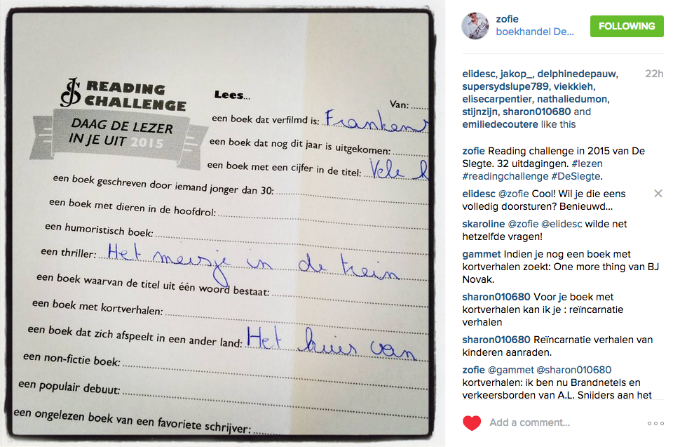 Vandaag belandde ik via een Instagram van @zofie bij de reading challenge van De Slegte. De categorieën deden mij instant glimlachen en uiteraard wou ik meteen mijn gelezen boeken van 2015 even mappen op dit lijstje. Ik besef ten volle dat deze reading challenge conflicteert met mijn reading challenge op Goodreads. Daar gaat het echter enkel om het aantal, meer bepaald 24. Bij De Slegte ligt de focus op de inhoud en andere gekke labels.