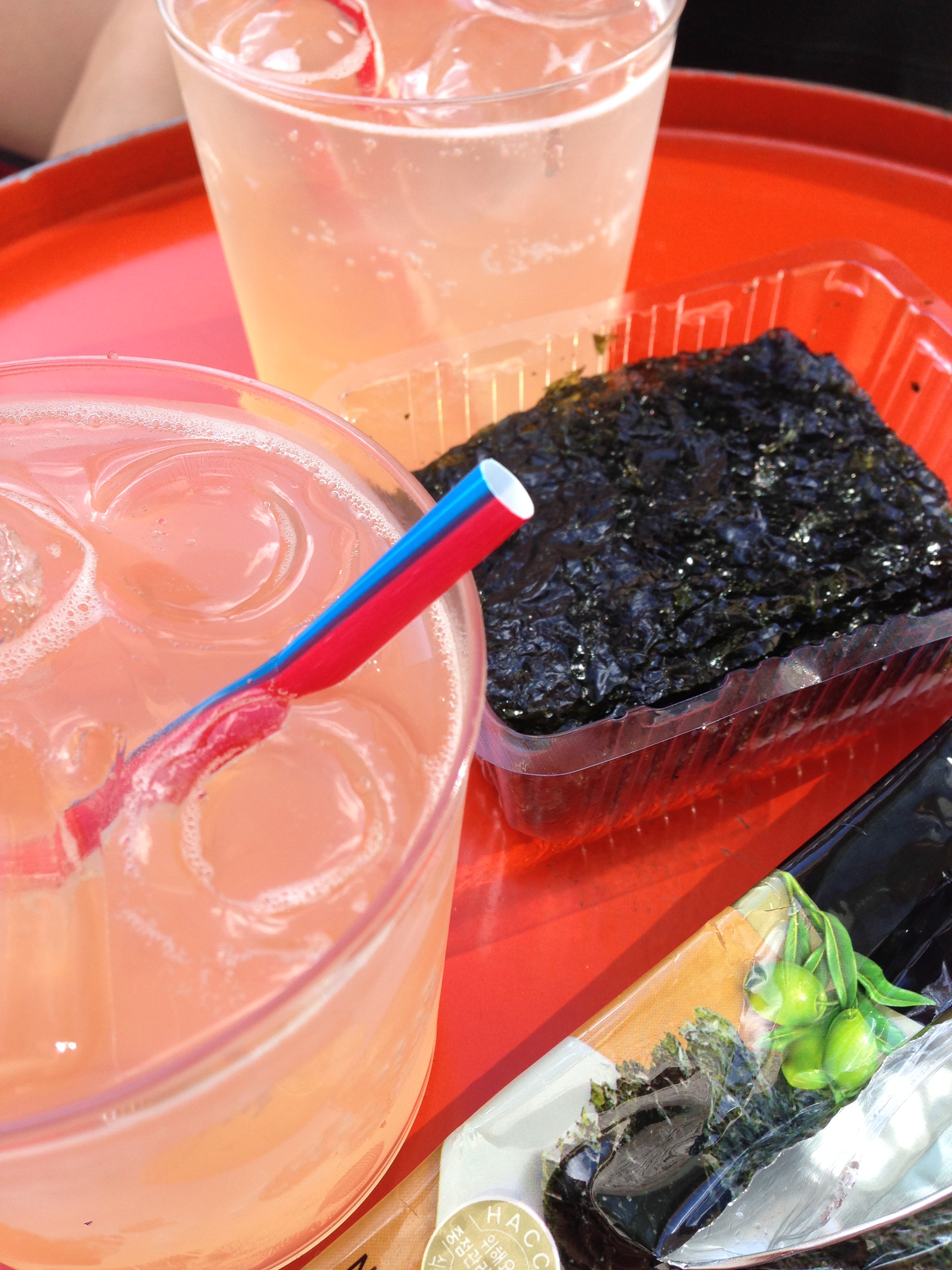 We starten met een MOKJA cocktail (€ 7) met daarin soju, elderberry, cranberrysirop. Als ik het naar buiten breng, ben ik niet helemaal zeker of er alcohol in deze cocktail zit. Even proeven en later ook googlen brengt raad: soju is de populairste alcoholische drank in Korea. Best wel verfrissend, deze cocktail! En bij wijze van aperitiefhapje eten we er kim (€ 3) bij, dat zijn flinterdunne zeewierblaadjes – oftewel erg gezonde chips.