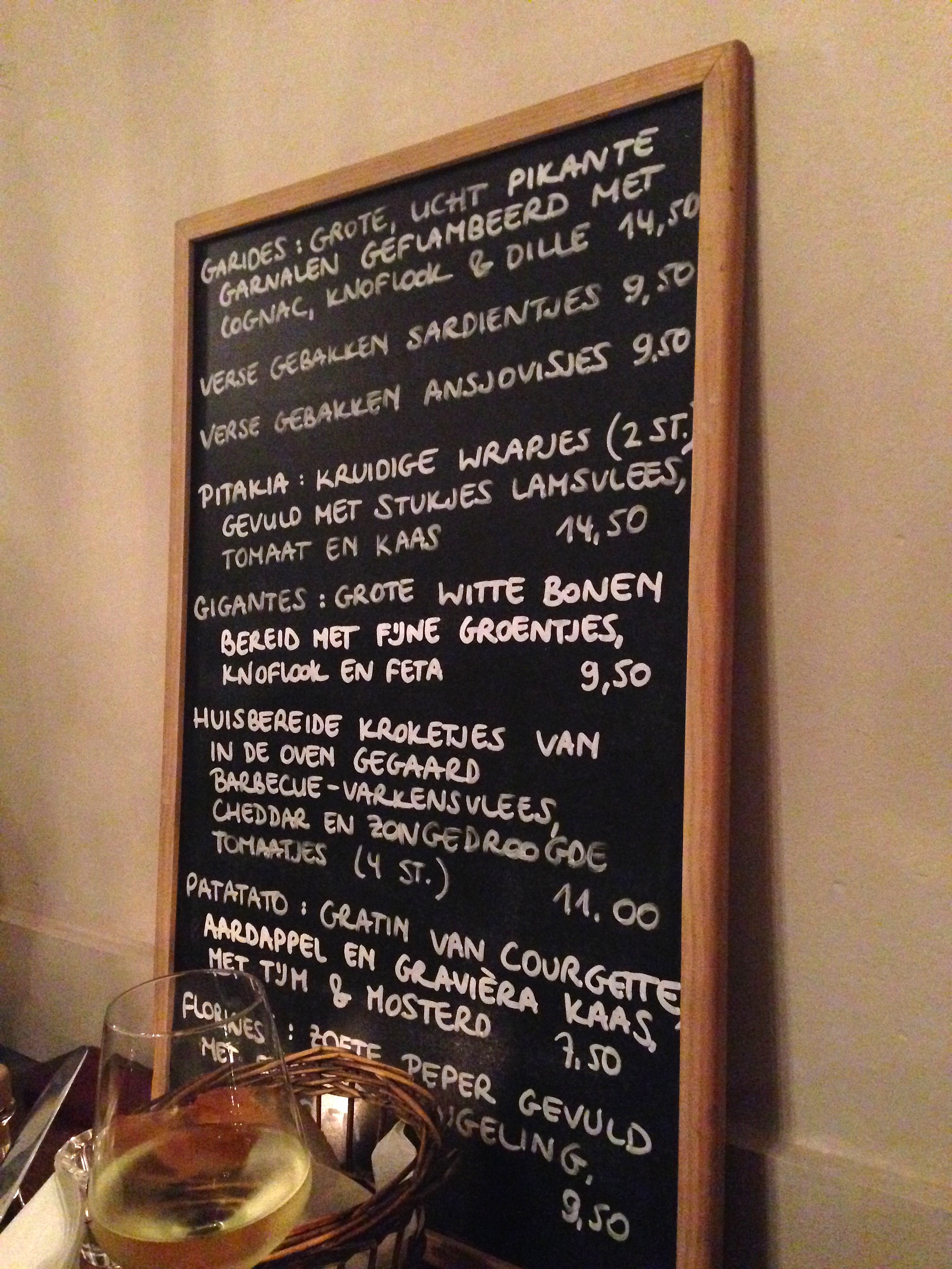 Voor de lunch kunnen we starten met twee gangen aan € 25 en zo verder aanvullen tot vijf aan € 50. Wij besluiten om op drie gangen af te kloppen: al het hartige en geen dessert. Klinken doen we met een glaasje cava (€ 7), in de bubbelcategorie staat verder ook nog champagne (€ 10) op de kaart. Daarna zullen we wijntjes per glas bestellen.