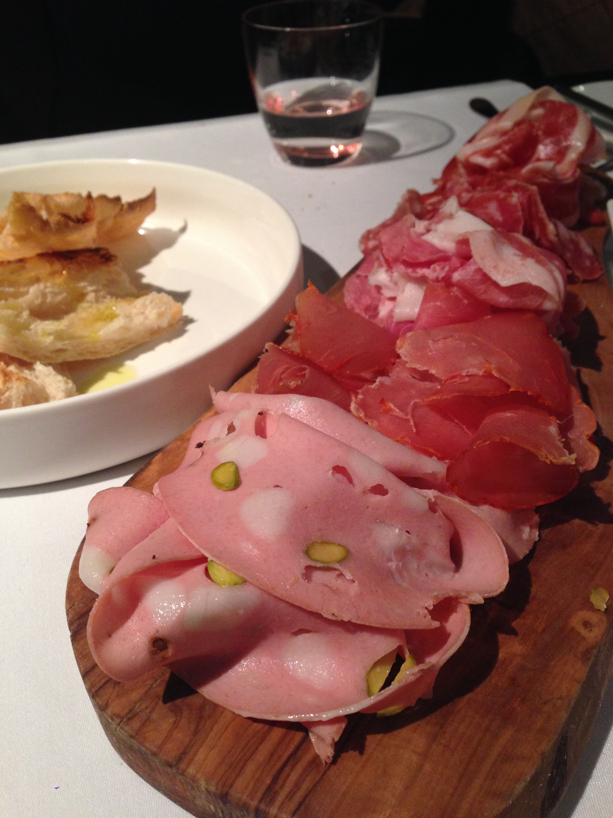 De menuvoorstellen laten we logischerwijs links liggen. Een hapje moet kunnen en zo belanden we bij de pagina met charcuterie en oesters. We besluiten om een assortiment charcuterie (€ 25) te bestellen, inclusief zes soorten vlees en wat brood. Ondertussen vraag ik nog een extra cava en snoepen we van de mix van groene en zwarte olijven.