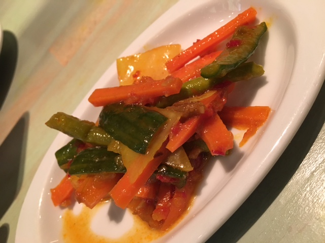 Op onze tafel verschijnt een bordje met zoetzuur opgelegde groenten, water en de gevraagde witte wijntjes. Eerlijk is eerlijk: bij een Aziaat ben ik altijd wat op mijn hoede wat wijn betreft, dus misschien maakte ik niet de slimste aperokeuze. Even nippen later moet ik dat helaas bevestigen. Soit, voor de rest van de maaltijd bestellen we wijn per fles omdat je zo toch iets meer controle hebt over wat er in het glas terechtkomt…