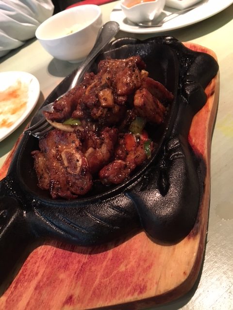 Verder volgt zo’n knisperend en rokende schotel in schaapsvorm met stevig gekruid lamsvlees en wat groentjes. Het smakelijke vlees knagen we van de beentjes; de peperachtige marinade prikkelt mijn zintuigen. Zo heb ik het graag!