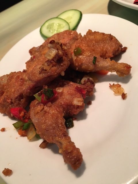 Tot slot verschijnen gefrituurde kwartelbilletjes en een bowl gebakken rijst. Het kwartelvlees blijkt uitstekend gebakken en bijgevolg bijzonder sappig onder die krokante korst. Trouwens ook een dikke duim voor de gebakken rijst: voor iemand die doorgaans koolhydratenarm tot -loos eet, grijp ik opvallend vaak naar die rijstkom.