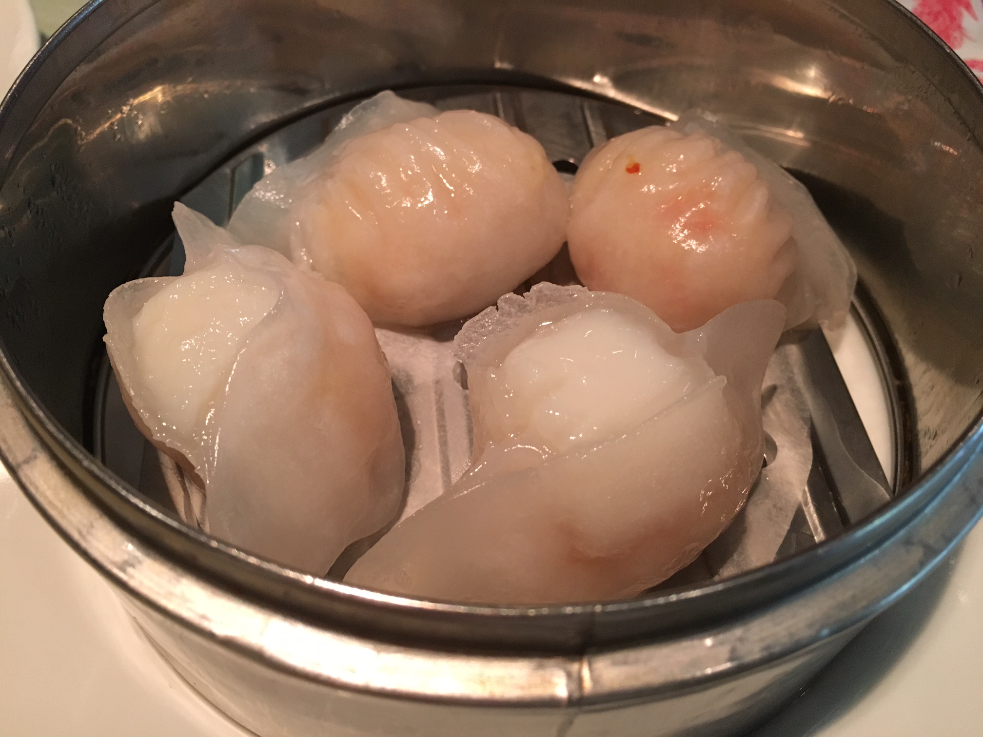 In een metalen stoommandje blinken gestoomde dim sum met garnalen, op twee wijzen. De ene zijn gevuld met quasi volledige garnalen, de andere met gehakte. Lekker! Hiervoor zijn we tot hier gekomen. Graag meer van dat, team 5 Flavors Mmei…