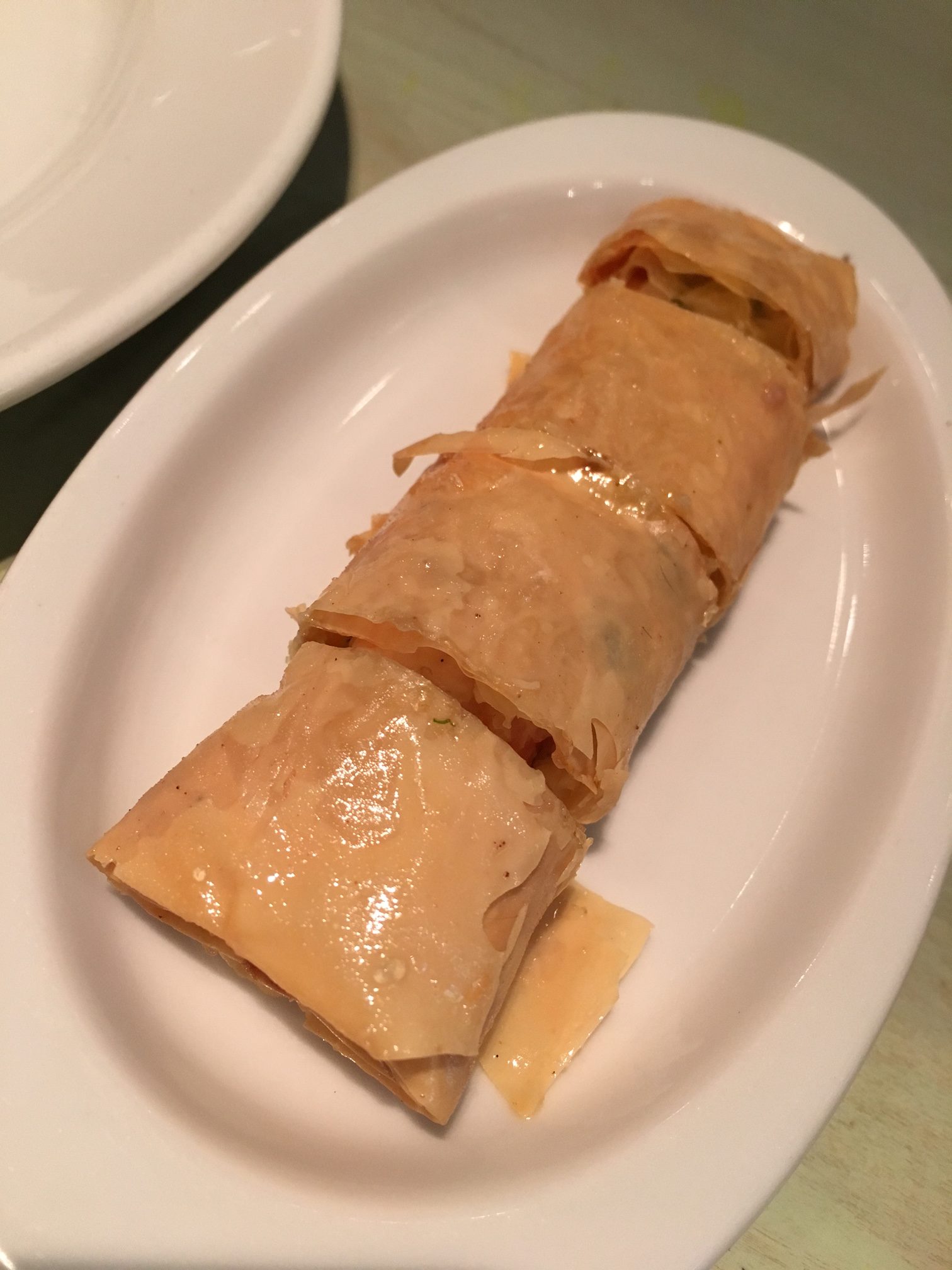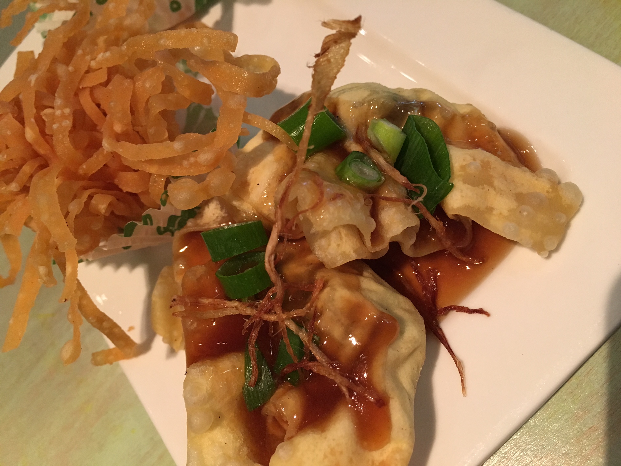 Maar dan blijkt de gestoomde ronde (helaas) al voorbij en belanden we bij de gefrituurde dim sum. Eerst krijgen we een smakelijke rol tofuvellen en groenten. Daarna volgt een bordje met nog twee soorten uit de frituurpan: buideltjes met varkensvlees afgewerkt met een sausje en nestjes van noedels met garnaal. De chef ziet de garnalen vandaag wel erg graag… Eerlijk gezegd dacht ik dat dim sum voornamelijk gestoomd waren, maar misschien ligt hier wel het bewijs dat ik de échte Chinese keuken nog onvoldoende ken. Ik reisde immers – en tevens helaas – nog nooit door het gigantische China.
