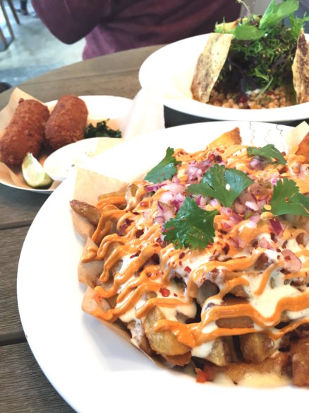 Het gulle bord kimchi cheese fries valt vooral qua volume op en er lijkt wel een virtueel uitroepteken boven te zweven dat waarschuwt voor deze ontegensprekelijke caloriebom. Het moet gezegd: een kleurrijke en fotogenieke caloriebom. Kimchi cheese fries bestaan dus uit een basis van frieten die getopt worden met kaas, BBQ beef en uiteraard kimchi – oftwel Koreaanse gefermenteerde kool of radijzen. Het geheel krijgt nog meer smaak door een frisse dressing (wellicht op basis van Griekse yoghurt), een pikantere saus (wellicht op basis van sriracha), versnipperde rode ui en verse korianderblaadjes.