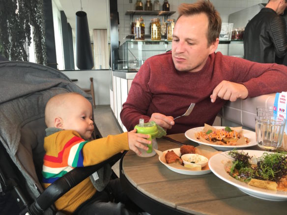 Het terras zit vol. Gelukkig vinden we binnen een tafel waarrond twee volwassenen en een buggy passen, zij het een beetje in de looplijnen van de cafégangers. De missie bestaat uit een snelle hap, dus met een suboptimale zitplaats kan ik zeker om.