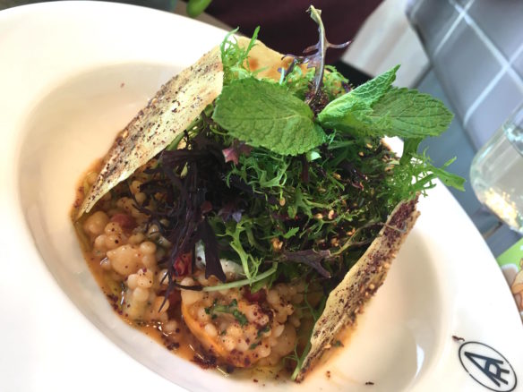 Mijn doelstelling om een Marokkaanse salade toe te voegen aan de bestelling wordt ondermijnd wanneer ik ontdek dat de basis van de salade bestaat uit handgerolde couscous. Nog meer koolhydraten, waar ik eerder dacht aan groentjes. Gelukkig zitten er door de fris gekruide couscous wat groenten gemengd en ligt er mooie sla bovenop. De verse munt en de krokantjes – waarvan ik er dus enkele extra kreeg en die overigens opgeleukt werden met olijfolie en kruiden – werken het geheel af.