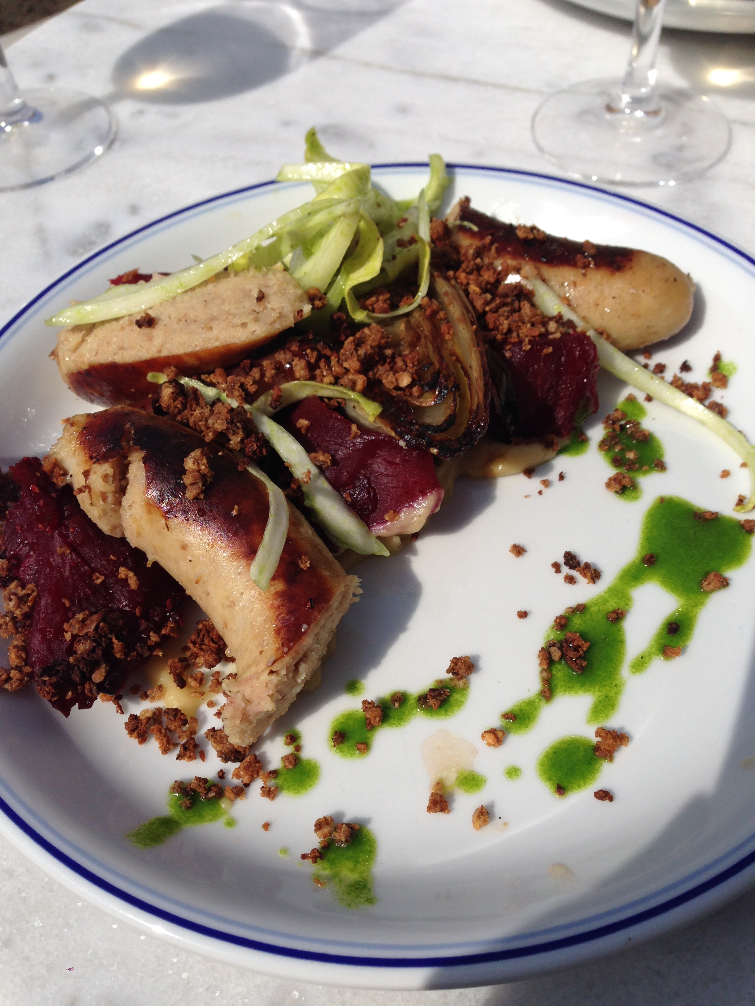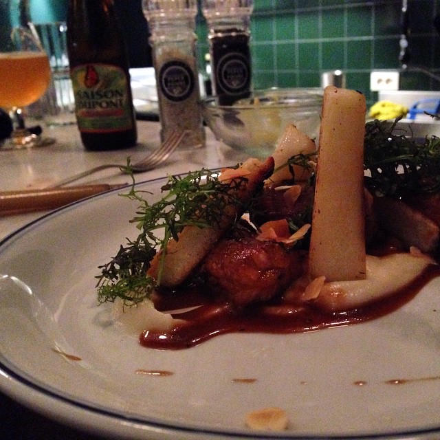 Beiden bekennen we een zwak voor witte pens te hebben, zeker als die van de barbecue komt. We zijn dan ook opgetogen over de daglunch bij Alberte, al moet ik wel toegeven dat bijvoorbeeld een paar van mijn collega’s met een megametabolisme de portie iets te klein zouden vinden. Ik niet. Ik ben meteen enthousiast: perfect gebakken witte pens van topkwaliteit, rode biet, gestoofd witloof, crumble voor de crunchiness, veel smaak.