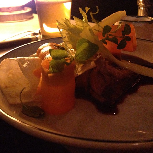 We krijgen inmiddels zin in wat we de vlotte chefs à la minute zien bereiden. Eerst tijd voor vis: hondstong, eigeel, champignon (€11) en mosselen, witbier, koriander (€10). Die hondstong herkennen we wel pas na even googlen als vis: blijkbaar familie van de zeetong. Het bord oogt verfijnd, eigentijds en bevestigt na het proeven. Dat mosselen matchen met witbier is een gegeven, maar koriander en gerookte forel doen het er net zo goed bij. Ik blijf wijngewijs bij de Meinklang, mijn vriend schakelt over op rood. De grappig klinkende Grololo (€5,50) van de Groslotdruif uit de Loirestreek laat zich inderdaad prima combineren met vis.