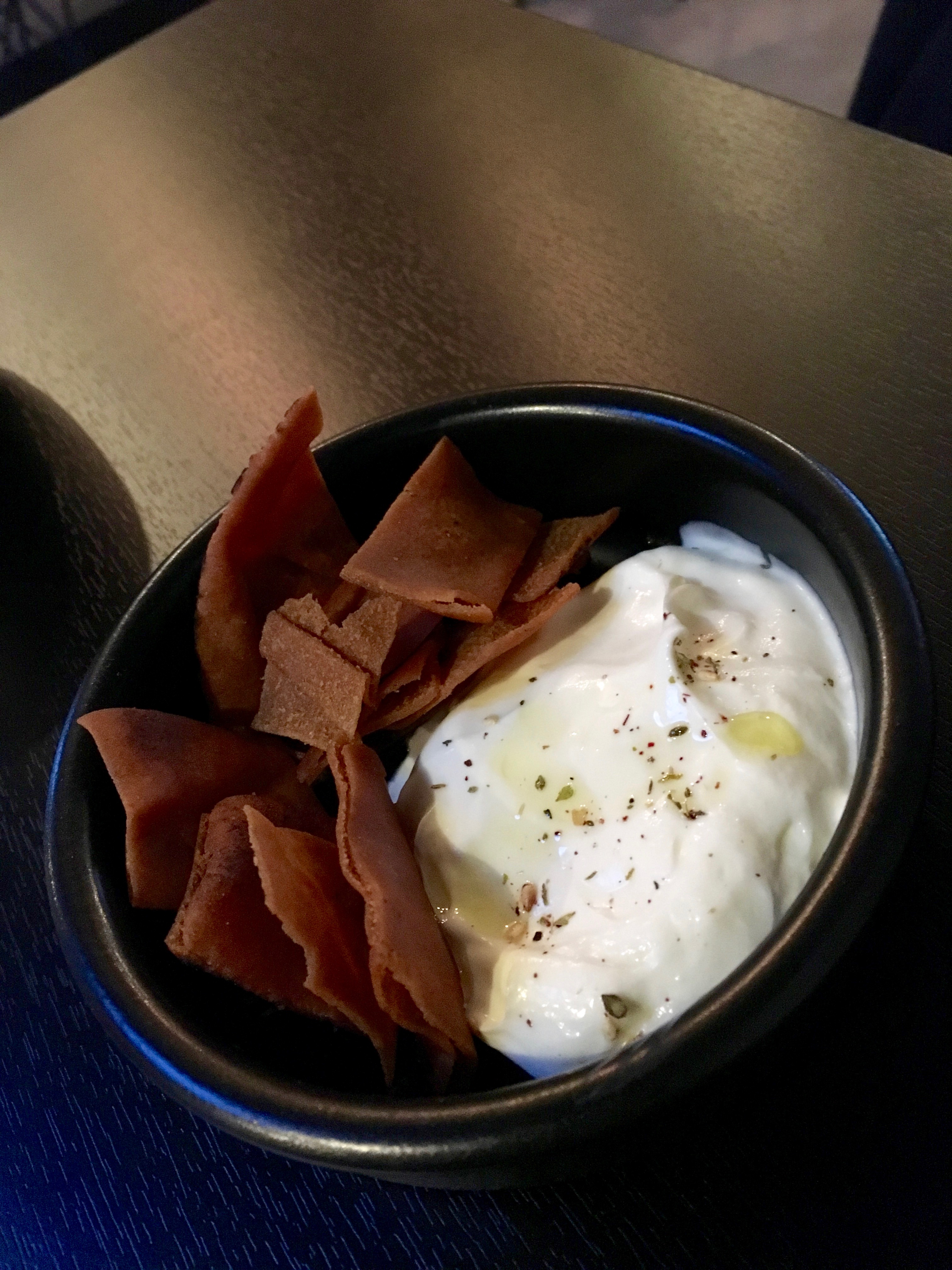 Inmiddels staat er al een leuke knabbel op tafel: ietwat zoete crackers met labne, die ik even later ook op de kaart ontwaar.