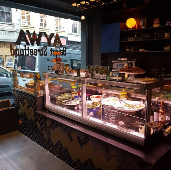 The new Libanese in town heeft momenteel nog zero online aanwezigheid, dus ik kan niet veel meer doen dan jullie het adres geven… Zelf nam ik geen foto van hun donkere voorgevel met in gouden letters AYWA – Beirut Streetfood op het raam, Instagrammer @viggoscoffee postte wel een leuke van binnen uit.