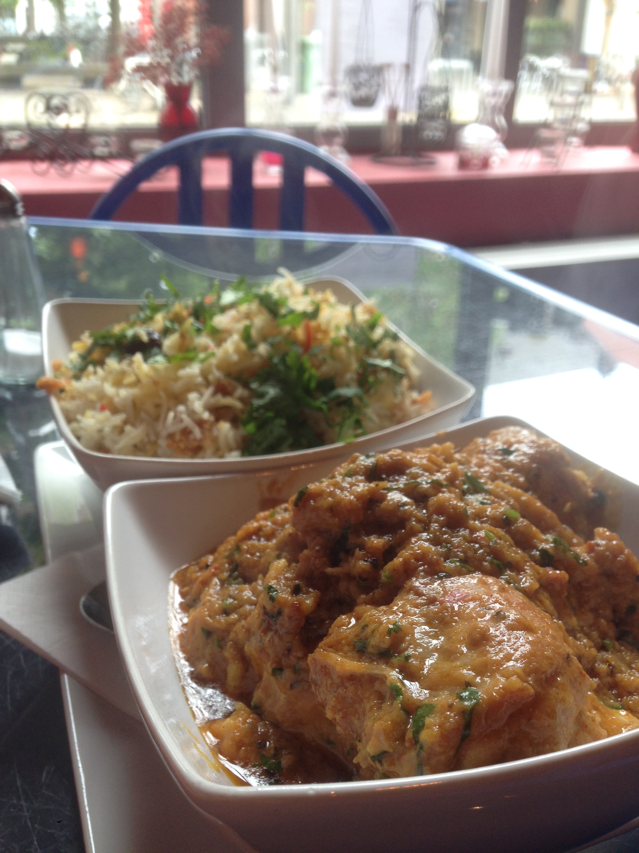 Toen ik informeerde of het voldoende zou zijn om één gerecht te bestellen, zei de jongeman mij dat ik nog altijd kan bijbestellen achteraf. Ik begin te lachen als hij met mijn bestelling verschijnt: twee stevige kommen met kip korma enerzijds en biryanirijst anderzijds. “Ik denk wel dat ik hiermee genoeg zal hebben!”, grinnik ik.
