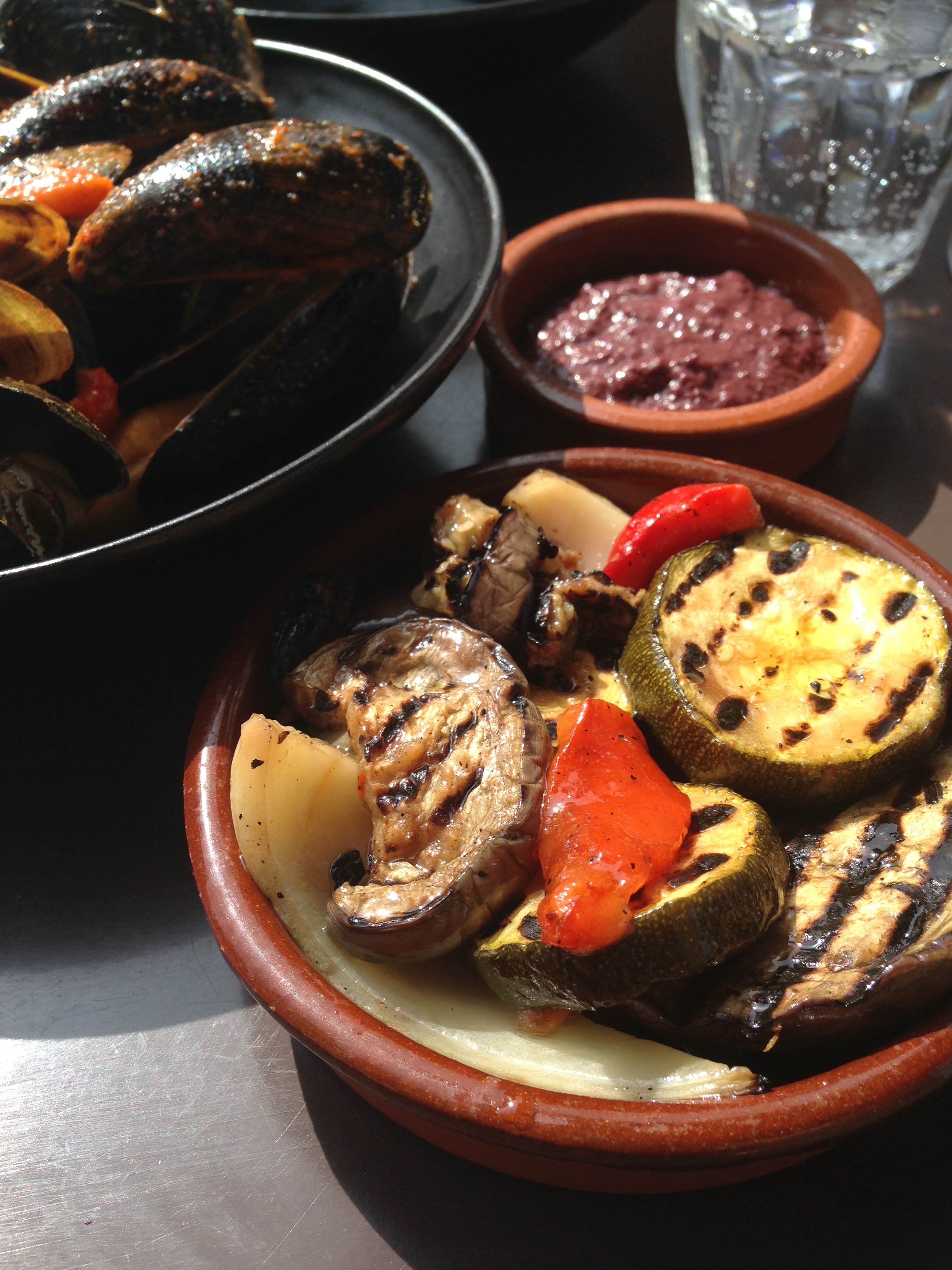 We vertrekken met een nieuw soort bubbels en uit het assortiment snacks selecteren we mosselen / harissa (€ 5) en gegrilde groenten / kalamata (€ 4) als voorafjes.