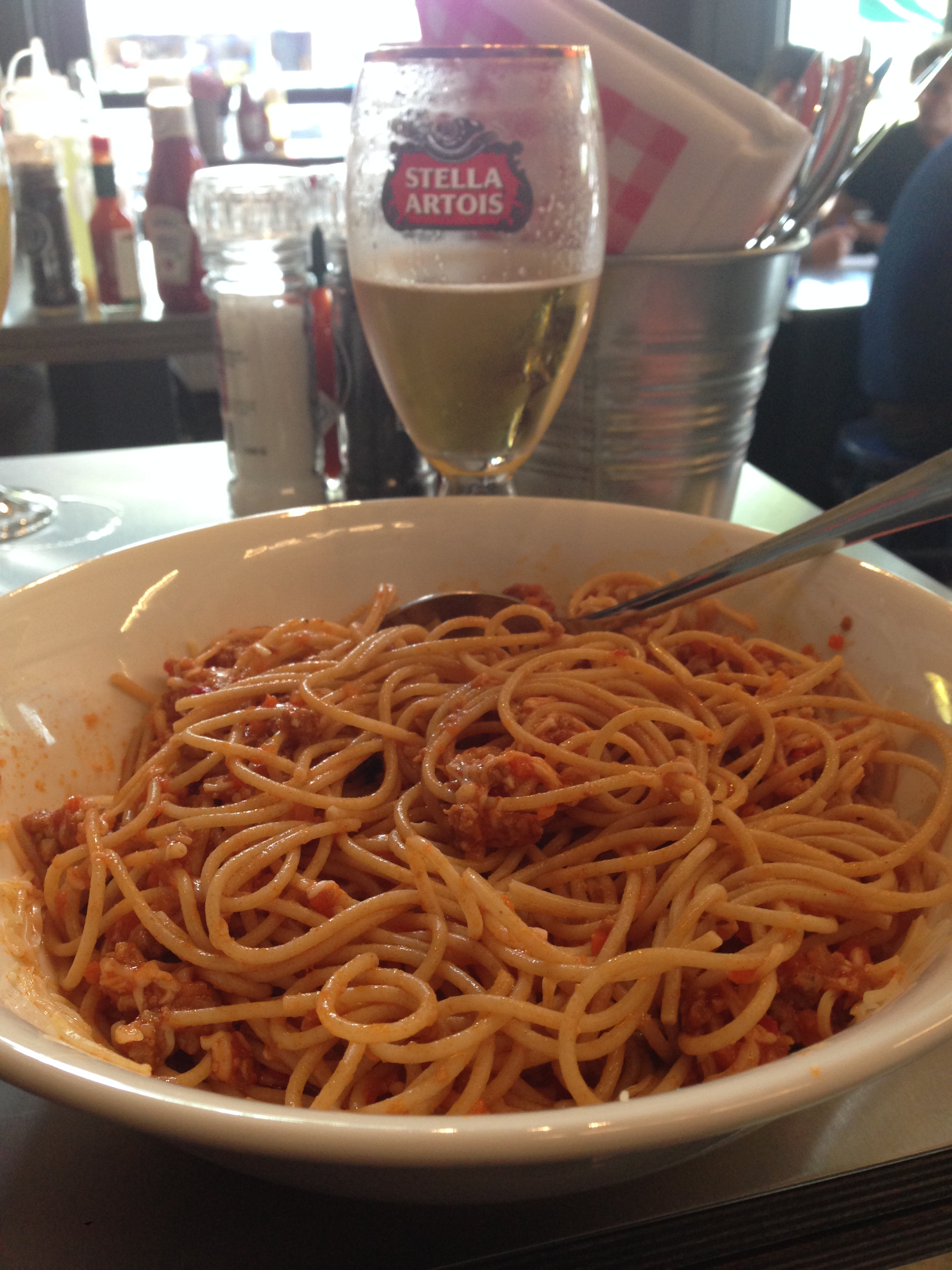 Ik kies voor een normale portie (€ 9) volkorenspaghetti met de ietwat pikante Bavet Special als saus en Emmentaler als kaas. Mijn collega wil liever gewone spaghetti met gewone Bavet-saus. Daarbij drinken we beiden een pintje: mijn favoriete Stella Artois in mijn favoriet glas op een voetje. Zo zie ik het graag!