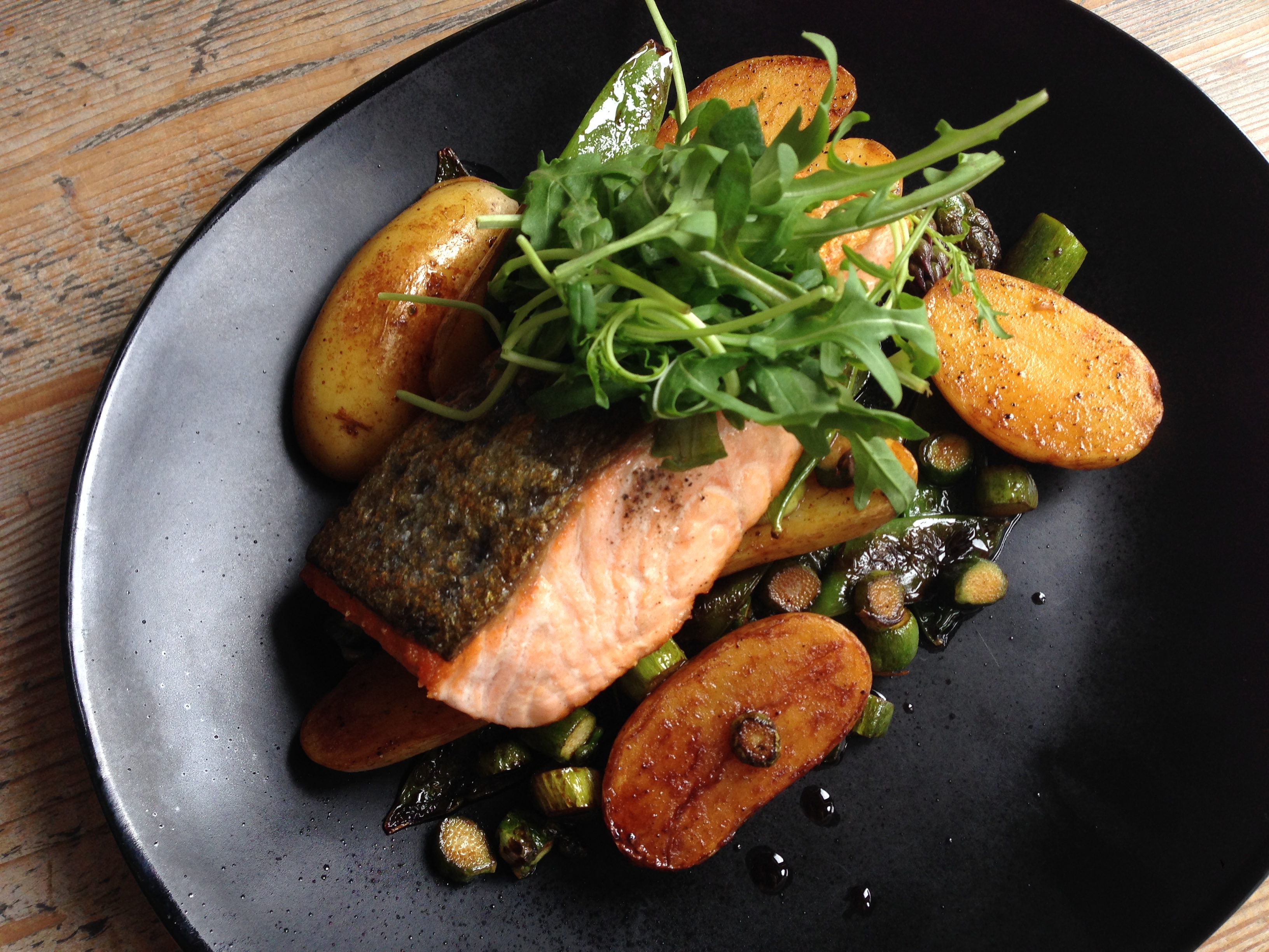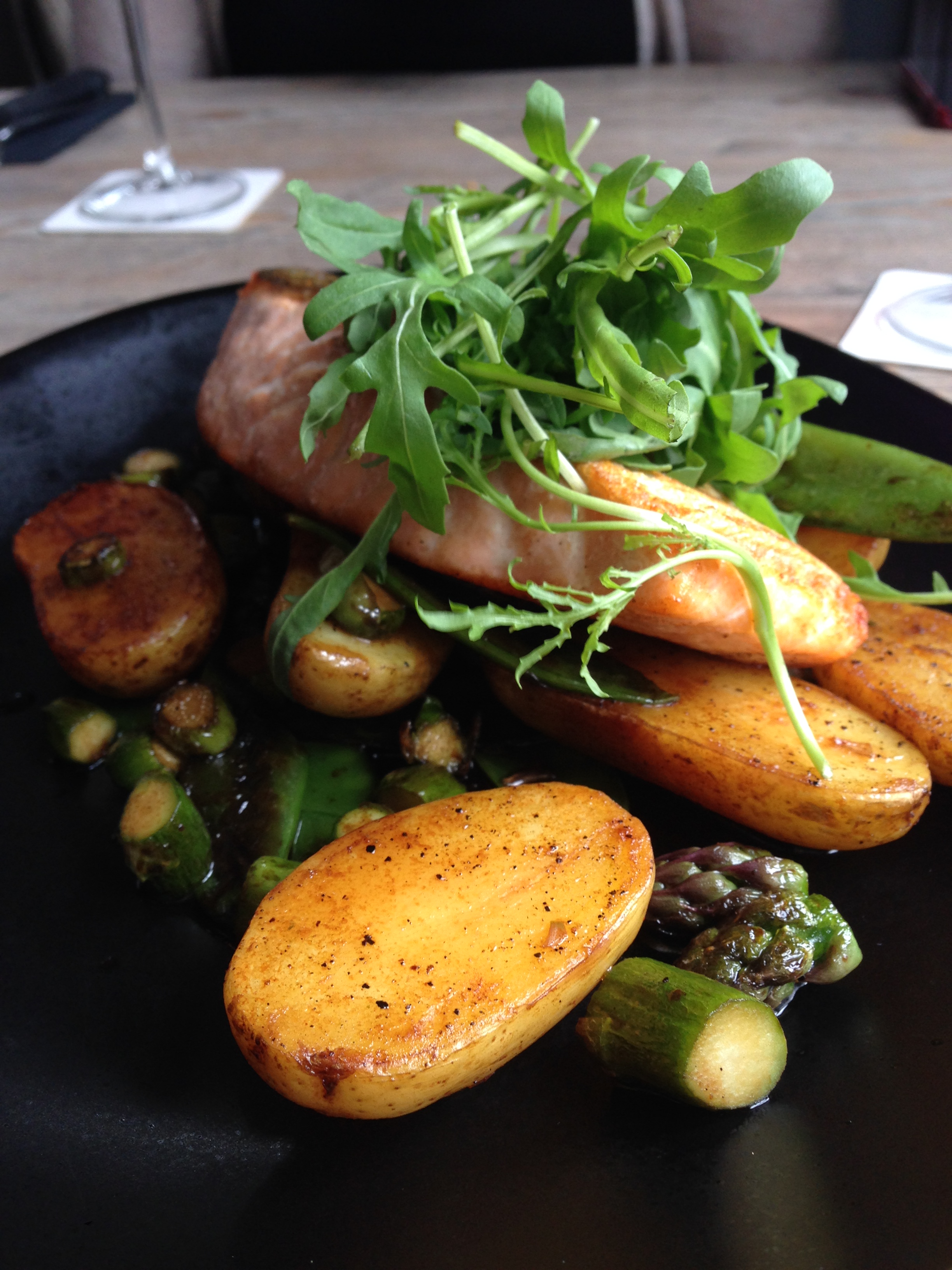 Hoewel zowel het gelijkvloers als de eerste verdieping vol zitten, volgen onze borden vrij vlot. Ik krijg als één van de eersten mijn keuze voorgezet en kijk verlekkerd naar het zwarte bord… Het overtreft mijn Café René verwachtingen en ook op de bereiding valt niets aan te merken. De zalm blijkt inderdaad perfect kort gebakken: nog mooi glazig vanbinnen, zoals het hoort. Zalm in combinatie met sojasaus werkt altijd. Ook de krieltjes, de peultjes en de groene asperges bevallen: nog wat beet, wederom zoals het hoort.
