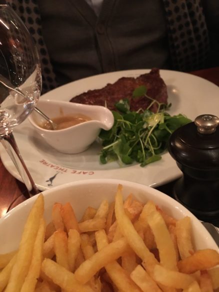 Ondertussen staat ons besluit vast. Mijn vader vraagt de gepocheerde zeewolf. Die blijkt helaas niet meer voorradig, bijgevolg switcht hij naar het tussenribstuk met pepersaus, frieten en veldsla (€ 29) als back-up plan. Ik ga voor iets atypisch Elise, niettemin een specialiteit van Café Théatre: rundstartaar bereid à la minute, frieten, sla, mayonaisedressing (€ 23).