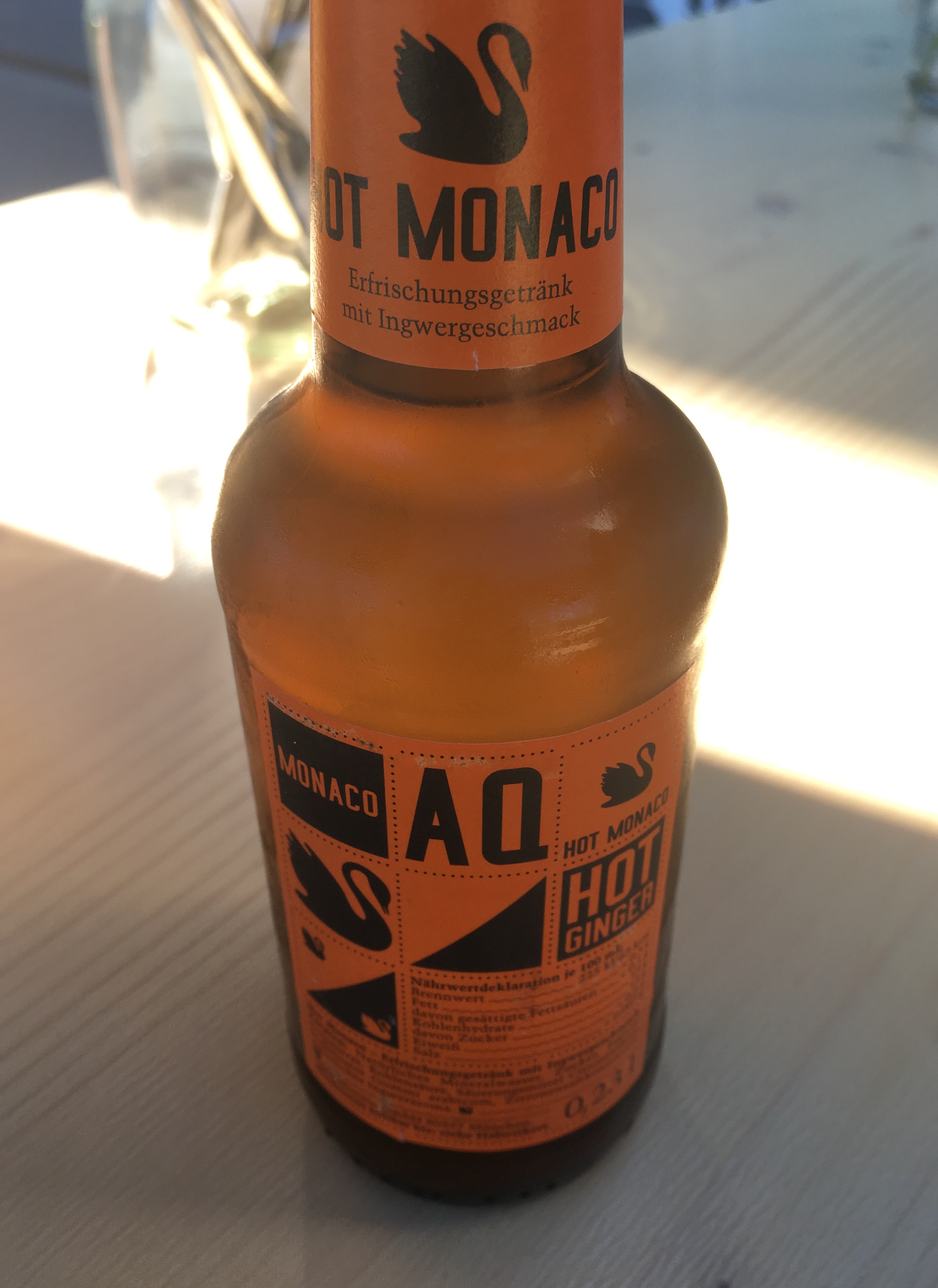 Mijn gezelschap zit al aan de (fris)drank, ik ga naar binnen met dezelfde intentie. Voorlopig staat er niets met gember op de kaart, maar omdat ik twijfel vertelt de juffrouw dat ze nog een testertje staan heeft van het ginger beer dat ze binnenkort zullen serveren – zij het in de iets minder hotte versie. Supersympathiek! Ik zie dat volledig zitten en ontdek bovendien een soort die ik nooit eerder proefde, meer bepaald Aqua Monaco (€ 3,20).