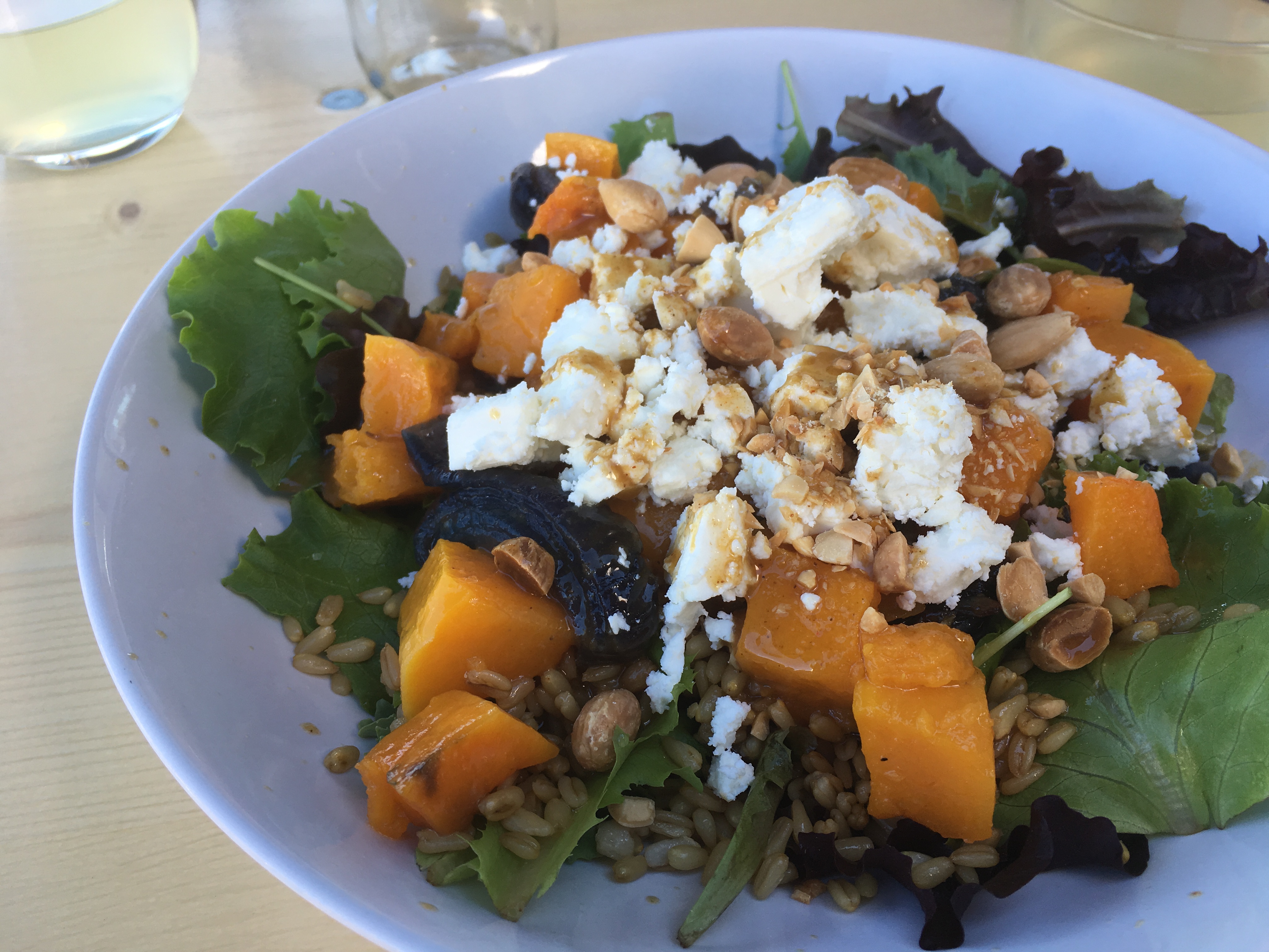 Op het menu staan een viertal boterhammen, een salade, een soep en een dessert. Het suggestiebord voegt nog wat keuzemogelijkheden toe. We kiezen beiden voor het slaatje van de vaste kaart met Orange in de naam die ik voor de rest vergeten ben. De hoofdingrediënten zijn gemengde sla, tarwe, pompoen, rode ui, feta, hazelnoten en honing (€ 11). Wel vragen we een bord mét en eentje ronder rode ui. No problemo.