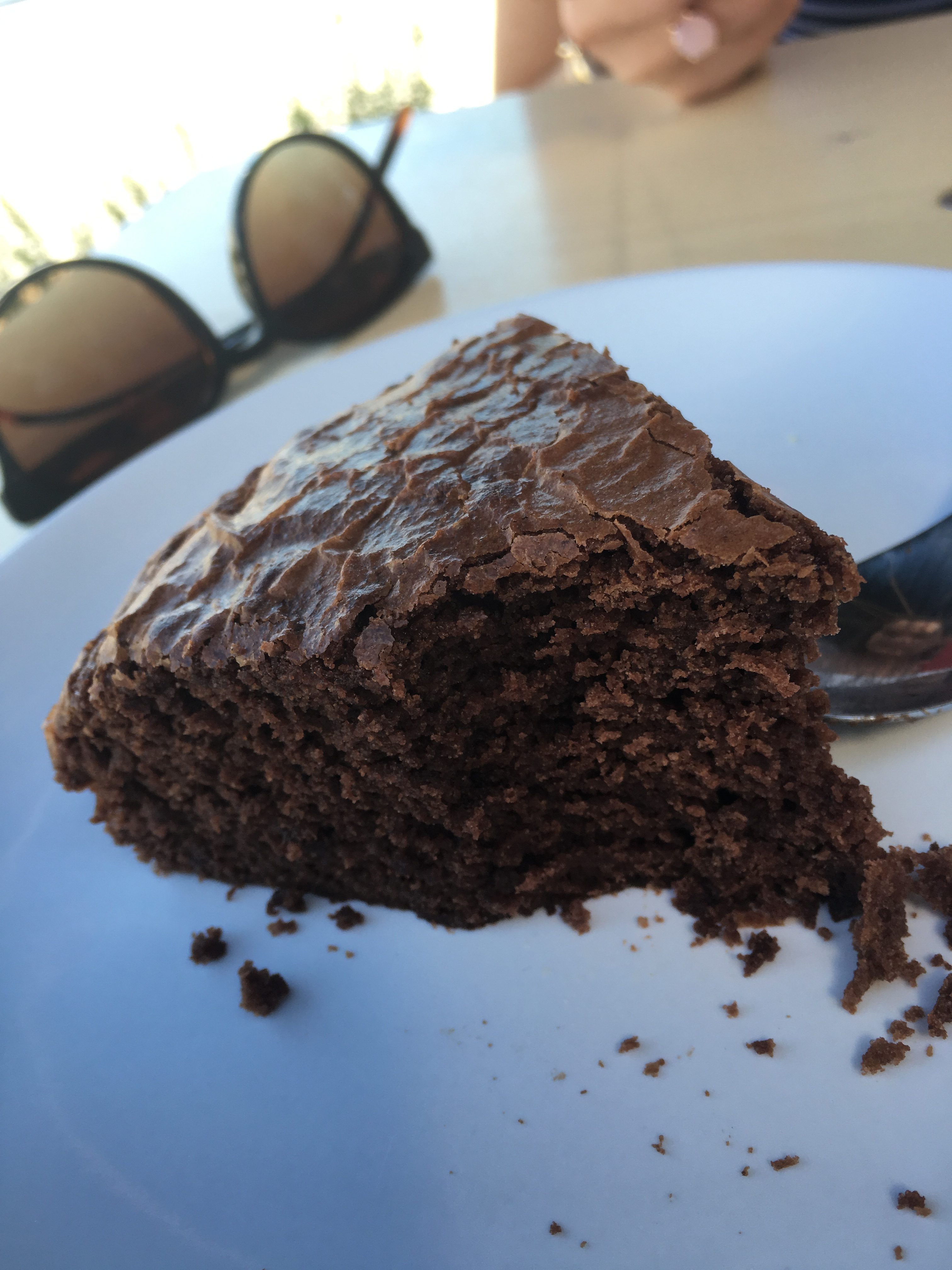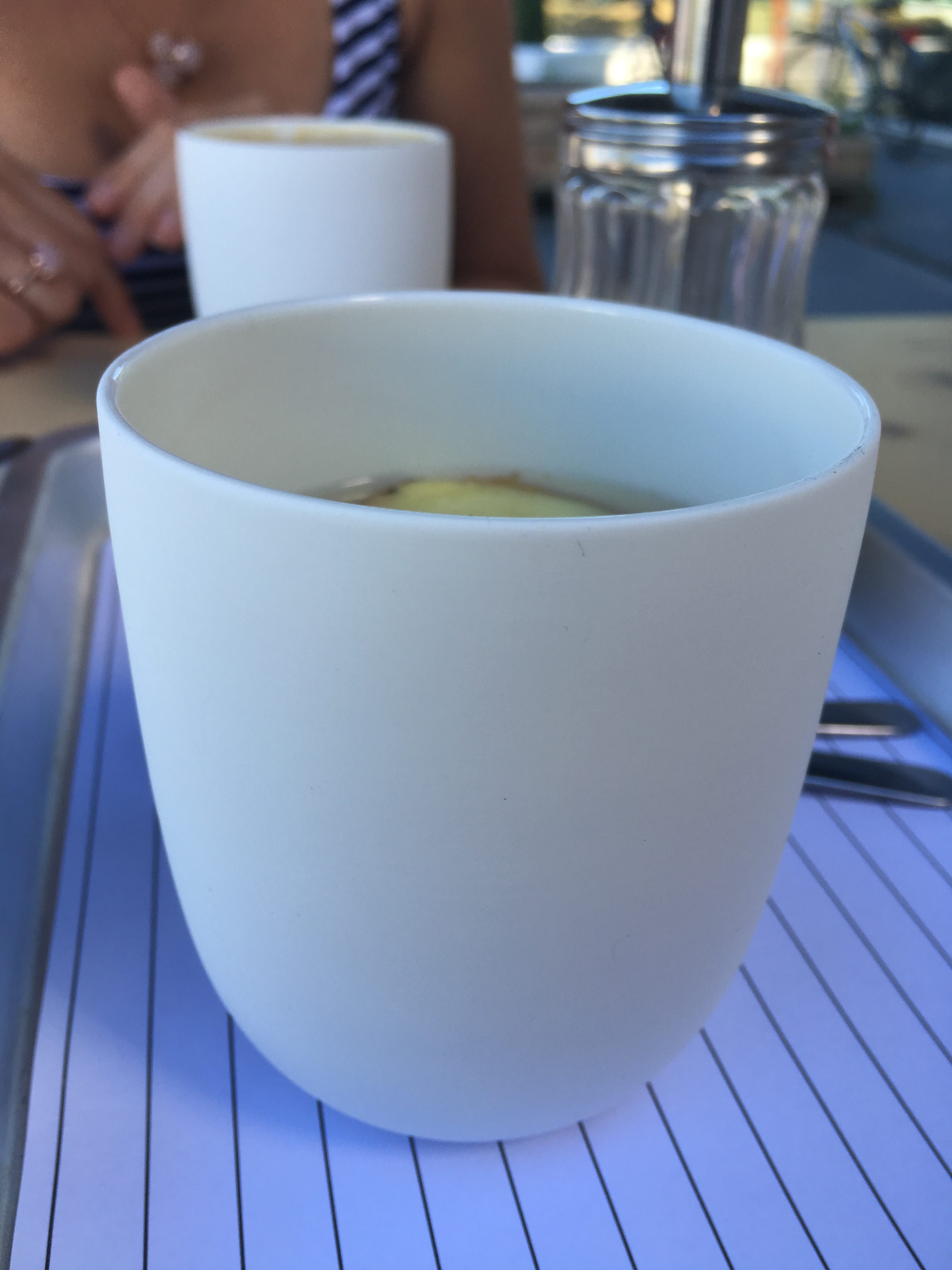 We besluiten om af te ronden met een gedeelde ‘cake of the day’: brownietaart (€ 4). Een goede beslissing, ook al blijkt de taart uiteindelijk lichter dan initieel ingeschat op basis van het woord brownie. Daar drinkt mijn vriendin een cappuccino bij (€ 3) en ikzelf een fresh ginger (€ 3,50) thee met verse schijfjes gember. Daar sippen we van in die leuke witte drinkbekers (van Serax, denk ik) met een matte buitenkant. Gewoon een erg prettig gevoel om vast te houden…