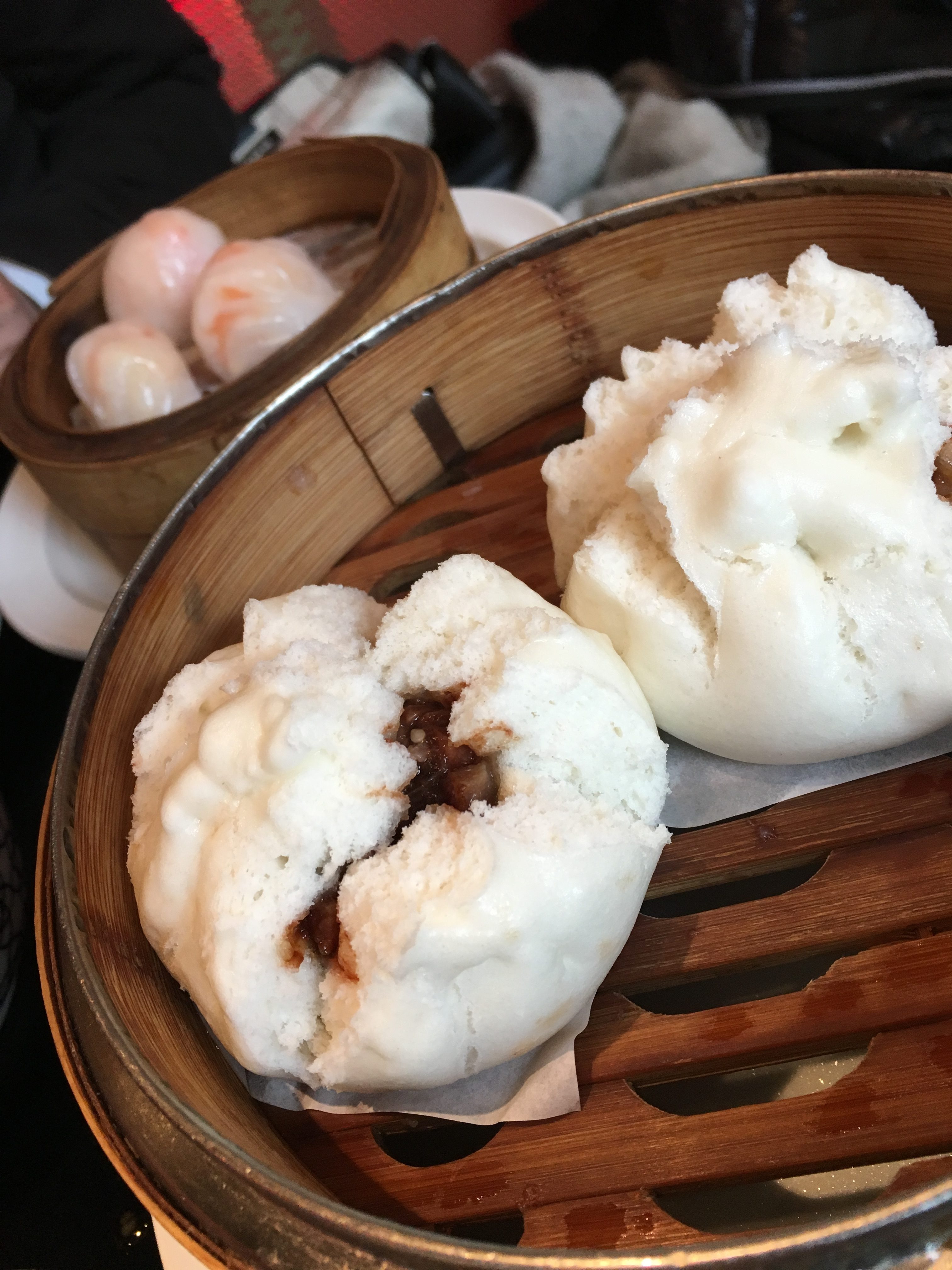 Zoals jullie zien, blijken de pork buns net iets te lang gestoomd waardoor ze opengescheurd zijn. Ik ga er toch van uit dat dat niet de bedoeling is… Toch kan dat de bunpret niet drukken, want het aangenaam wattige broodje omvat smeuïg en op de barbecue klaargemaakt varkensvlees. In de achtergrond shinen de gekende transparante dim sum met garnalen nog. Wederom een winner!