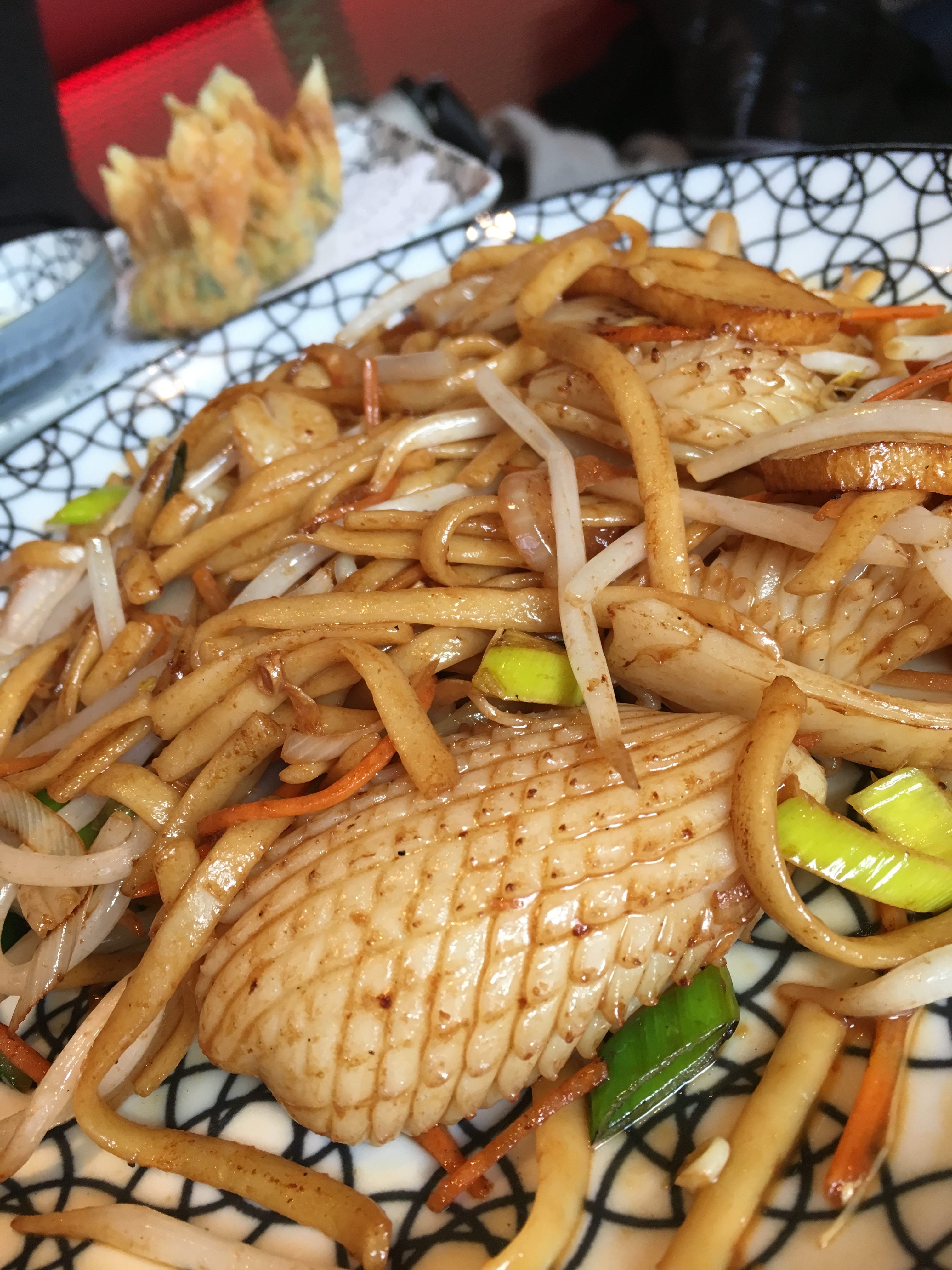 We gaan over naar het derde hoofdstuk. Ik wil de fried vegetable wanton (€ 4,80 – 3 stuks) graag nog proeven en hou me uiteindelijk toch niet aan mijn voornemen om enkel dim sum te bestellen. Op naburige tafels zie ik namelijk van die diagonaal ingesneden inktvis blinken en ik ga overstag… Tot slot dus tevens de fried noodle seafood (€ 14).